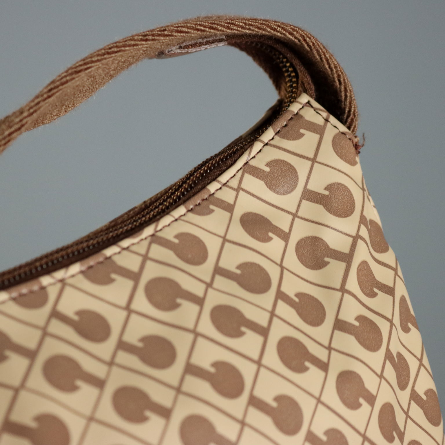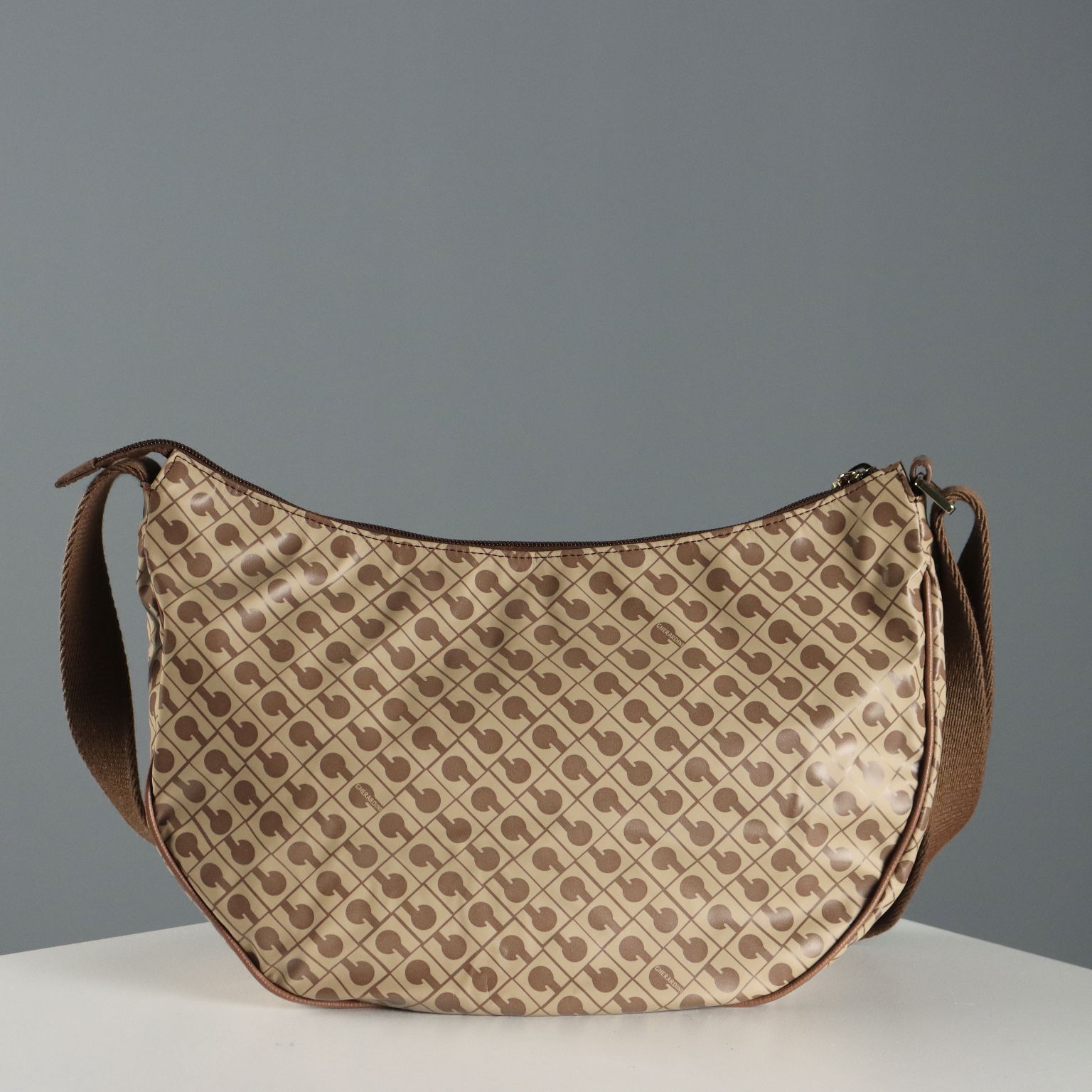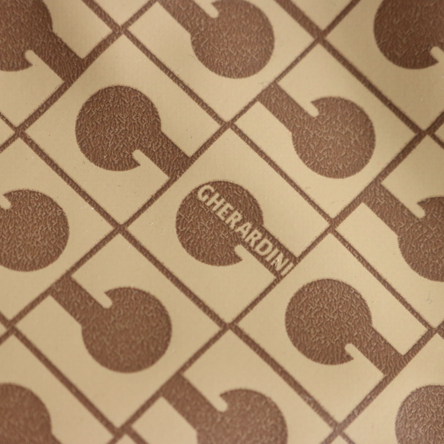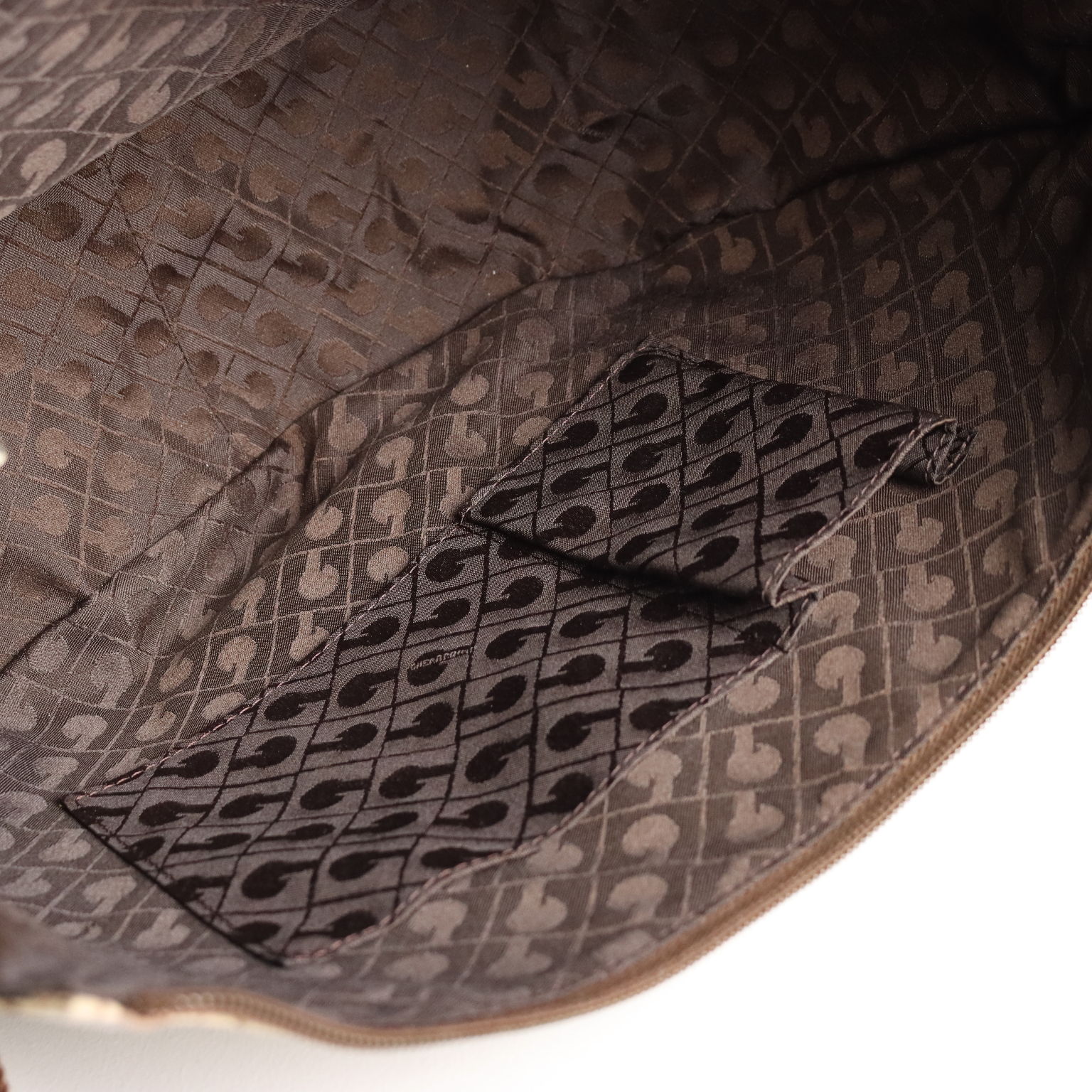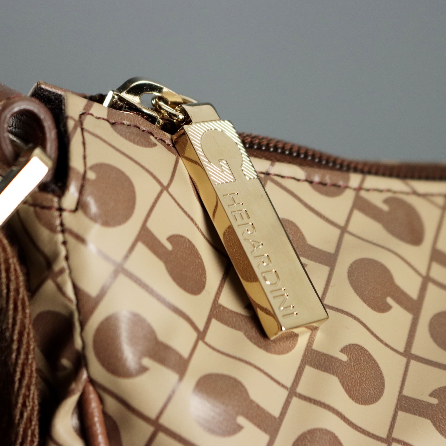Borsa a tracolla in tessuto Softy sui toni del tortora e marrone, con fodera interna e tre tasche, una con cerniera e due, più piccole, aperte. Chiusura con zip e tracolla regolabile. Il tessuto Softy è un tessuto spalmato, brevettato da Gherardini negli anni '70 e con il tempo perfezionato, con le caratteristiche di essere morbido ed elastico ma, allo stesso tempo, resistente e impermeabile.