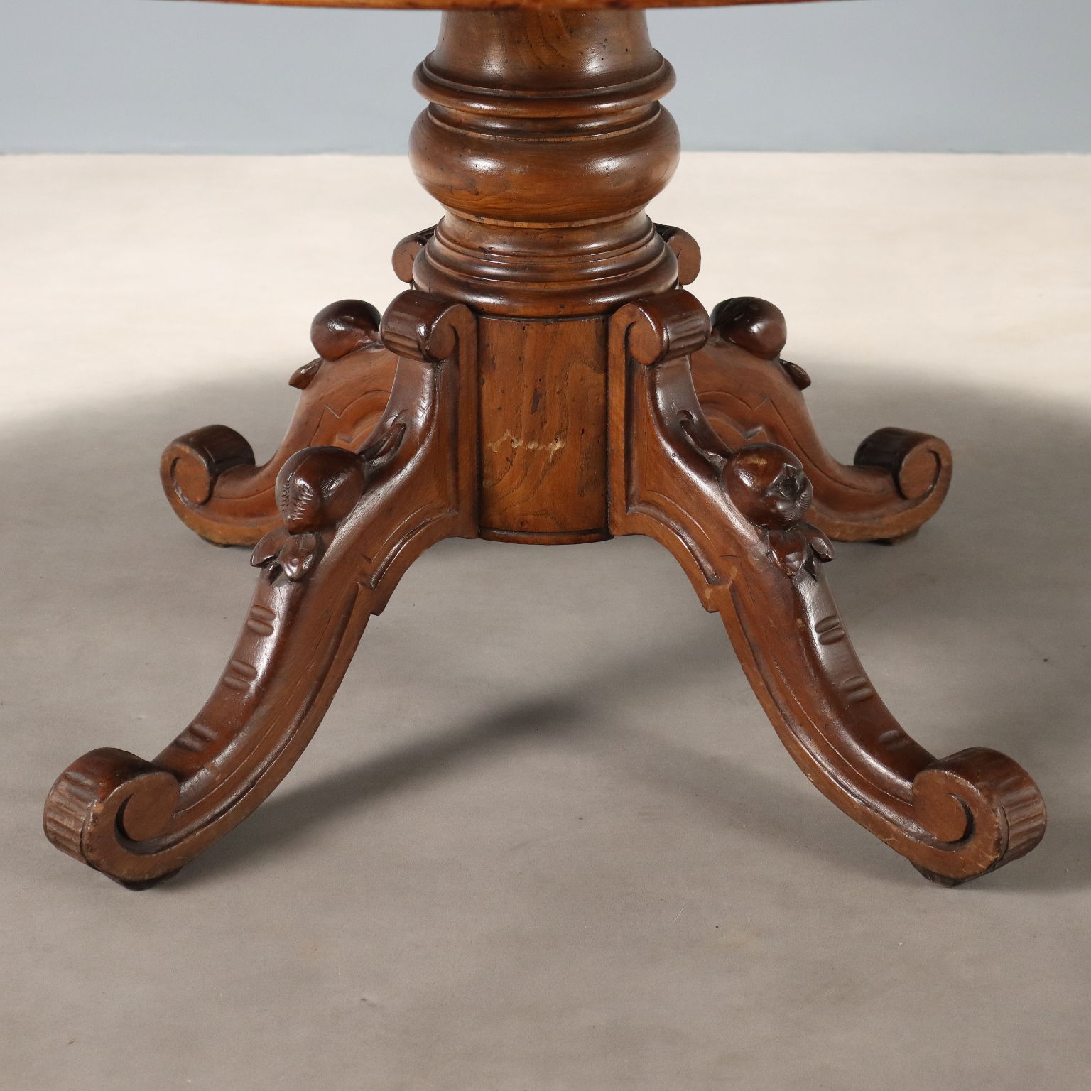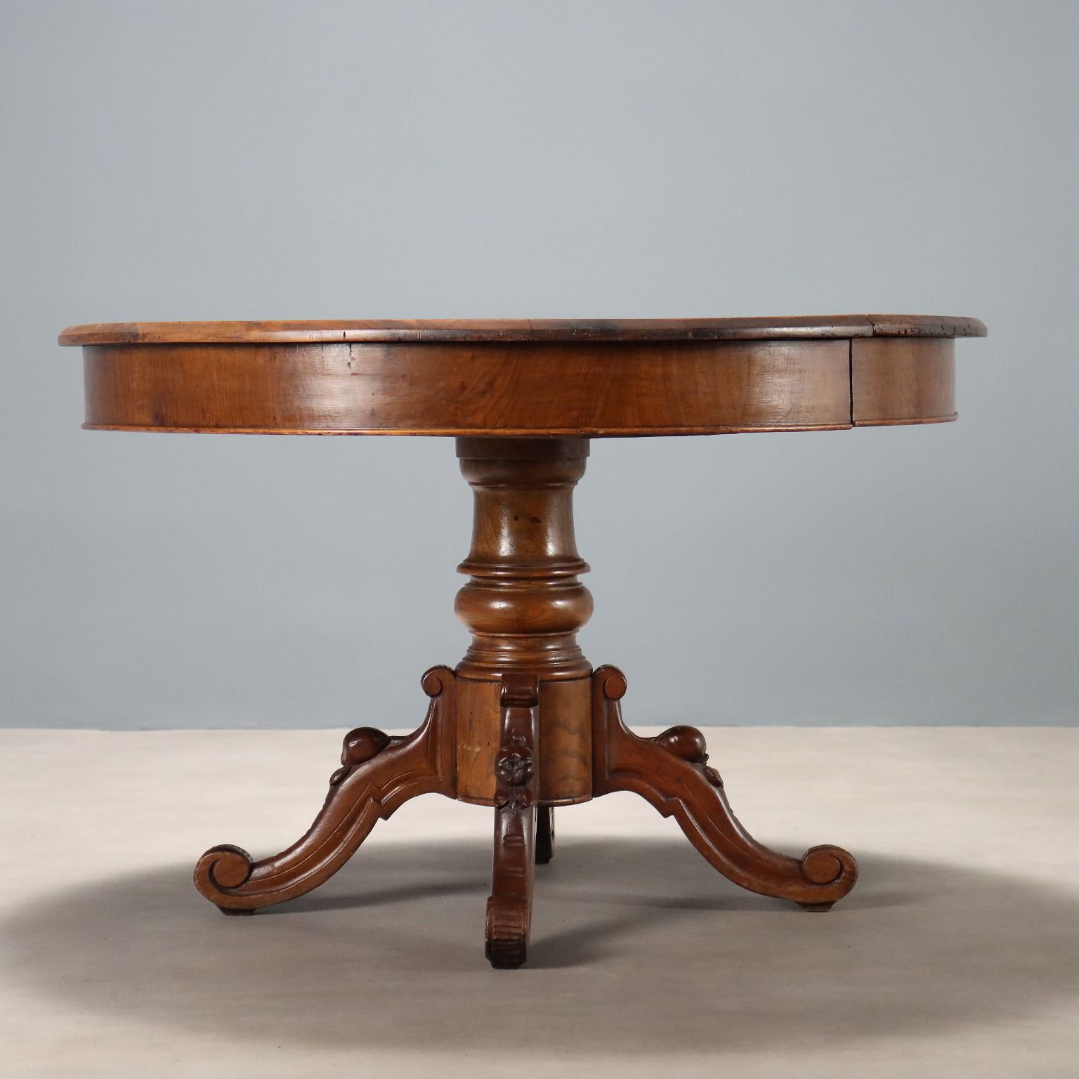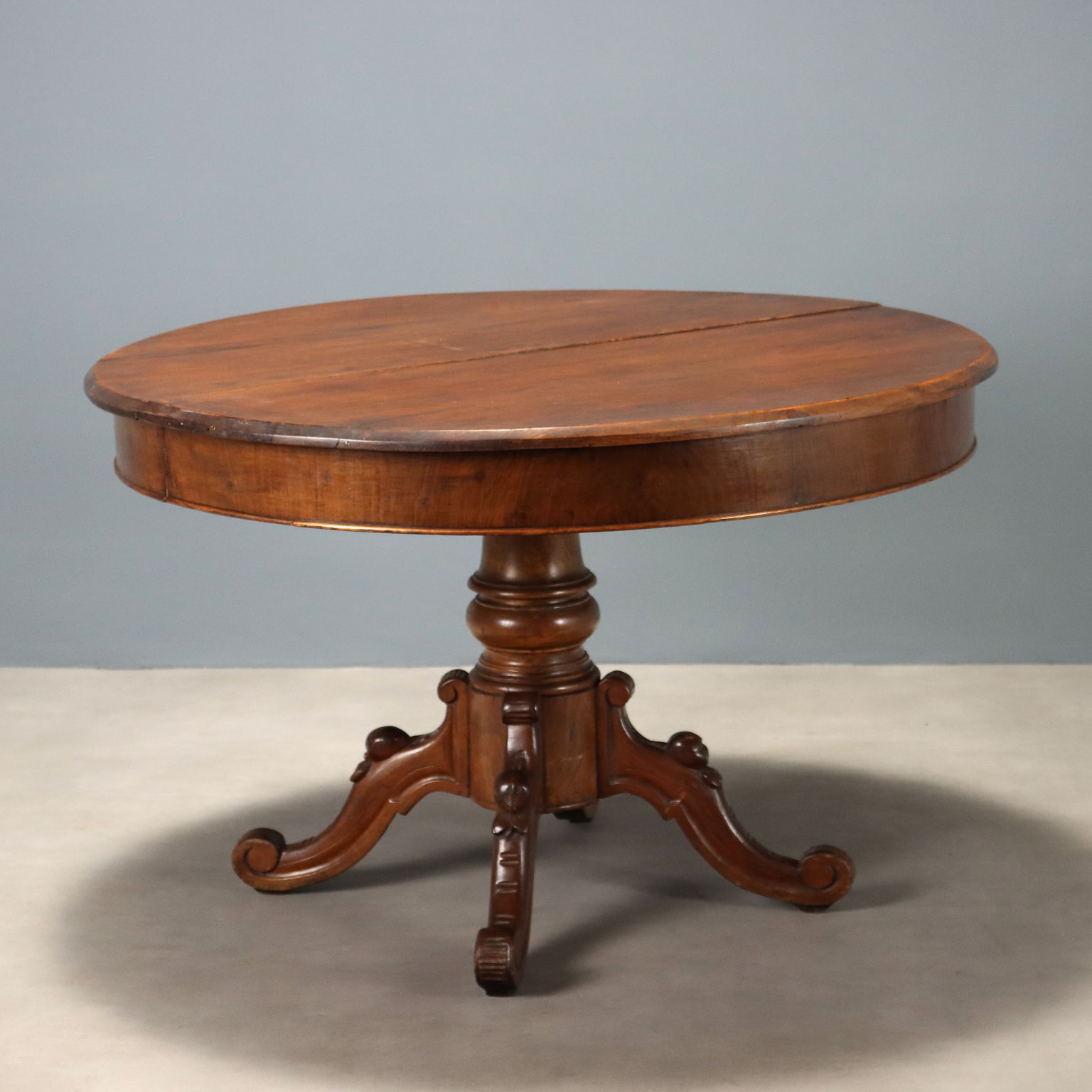 Tavolo tondo in noce. Piano allungabile con gambe di sostegno a scomparsa, gamba centrale tornita poggiante su quattro piedi mossi e intagliati, culminanti con riccioli. Italia, XIX Secolo.