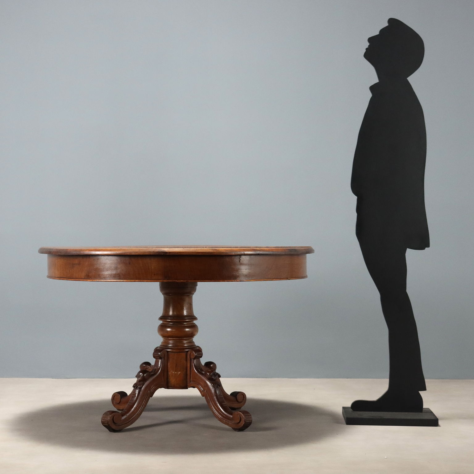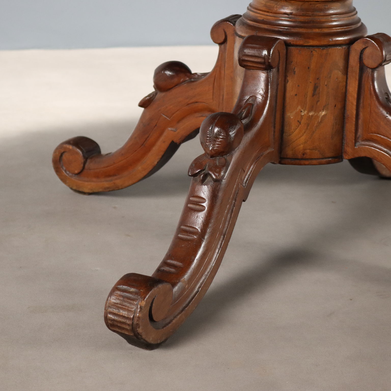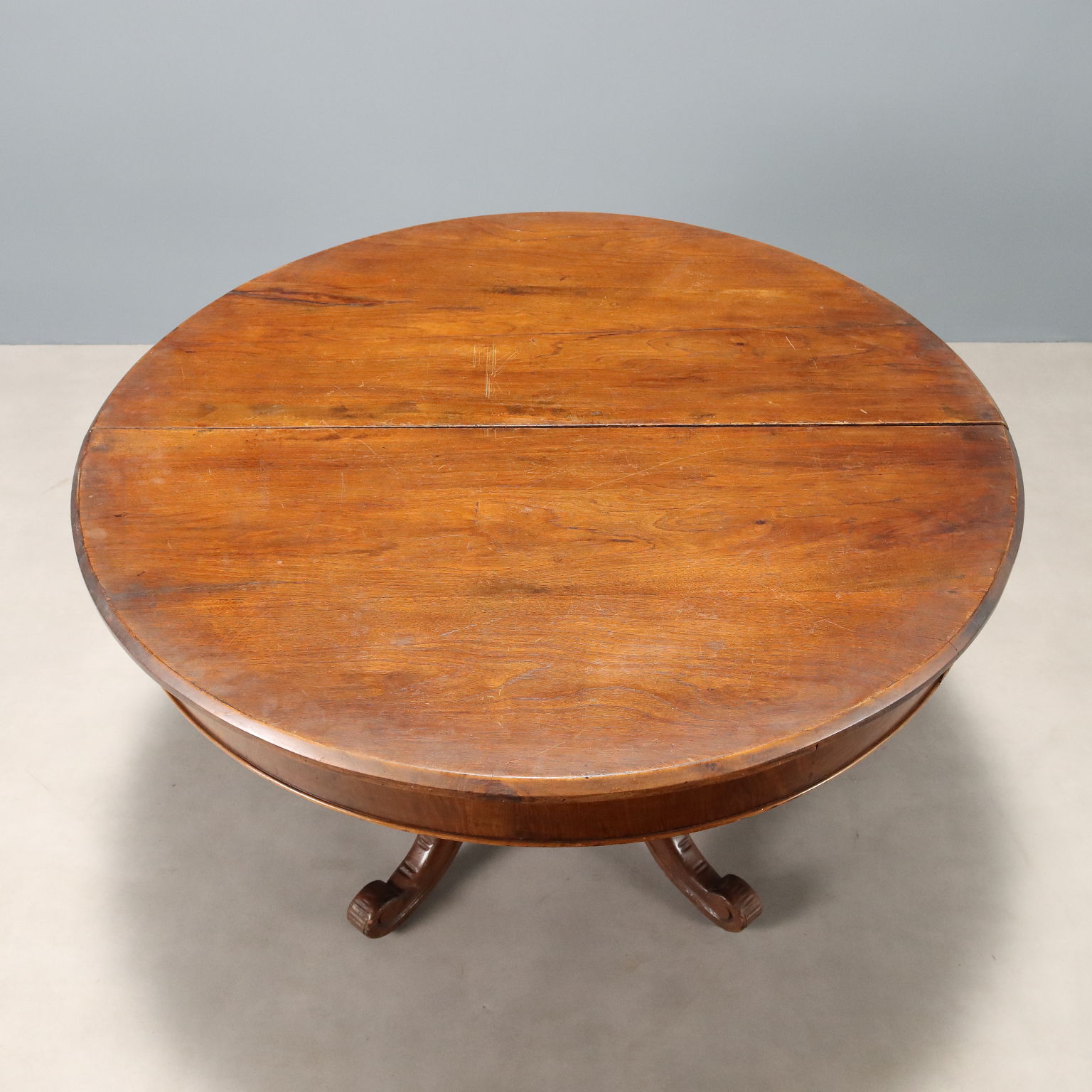 Tavolo tondo in noce. Piano allungabile con gambe di sostegno a scomparsa, gamba centrale tornita poggiante su quattro piedi mossi e intagliati, culminanti con riccioli. Italia, XIX Secolo.