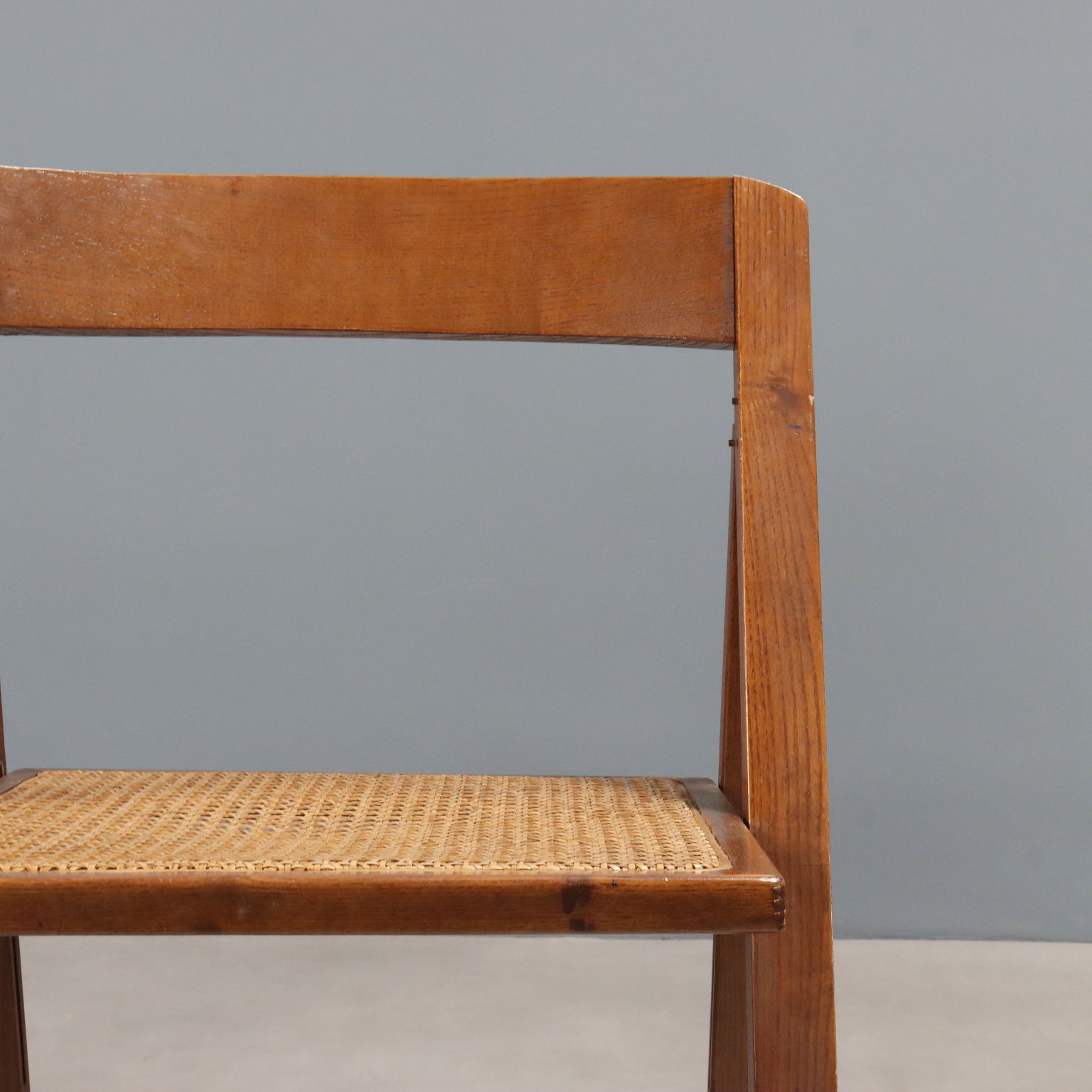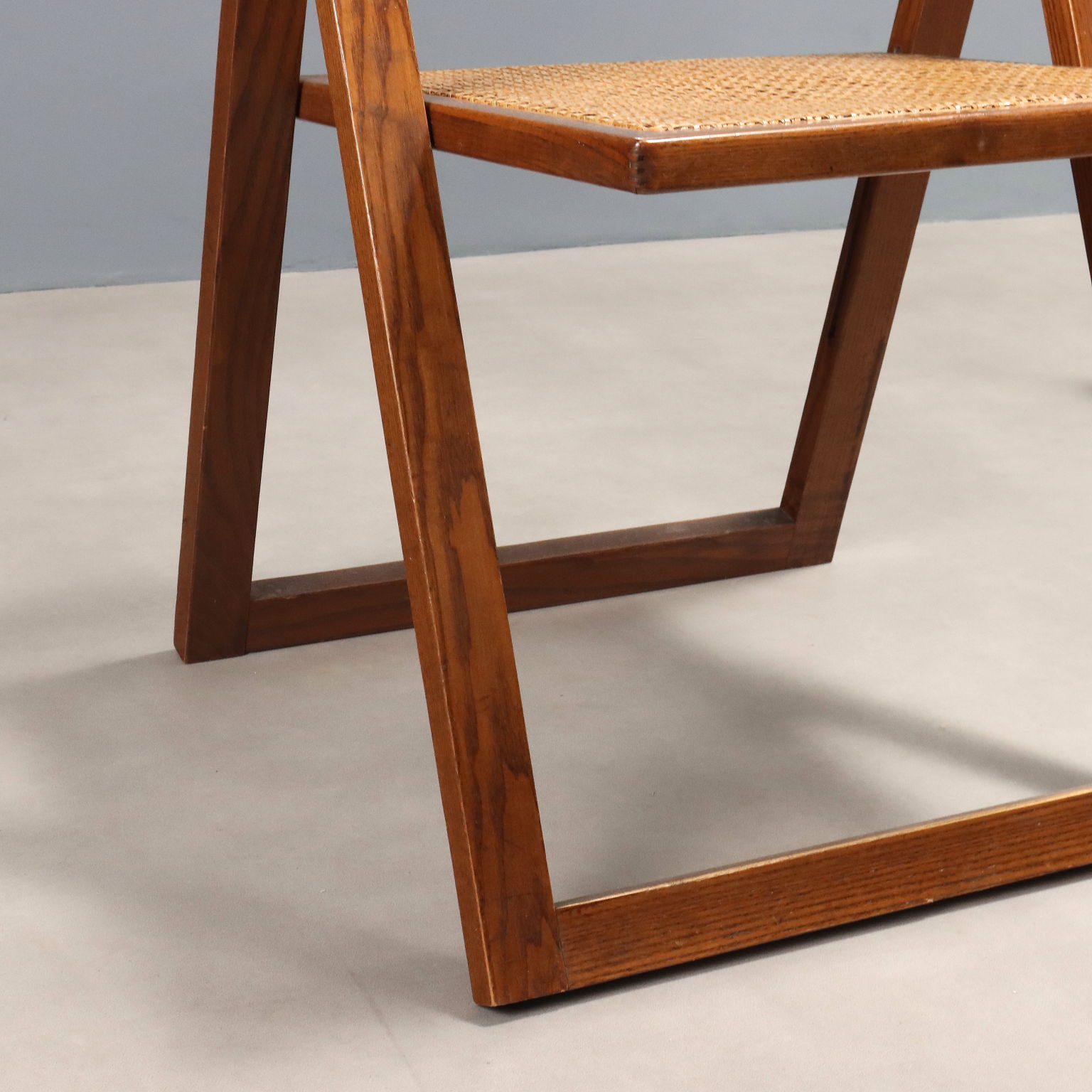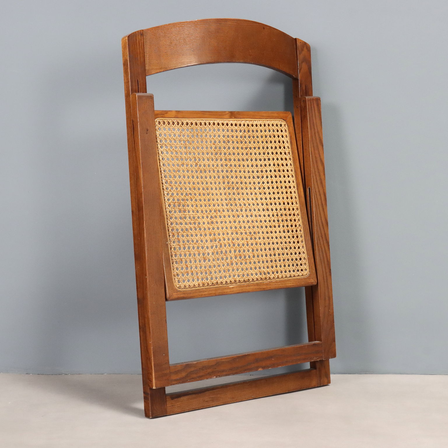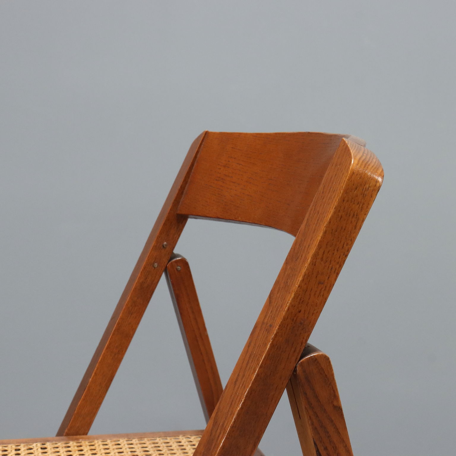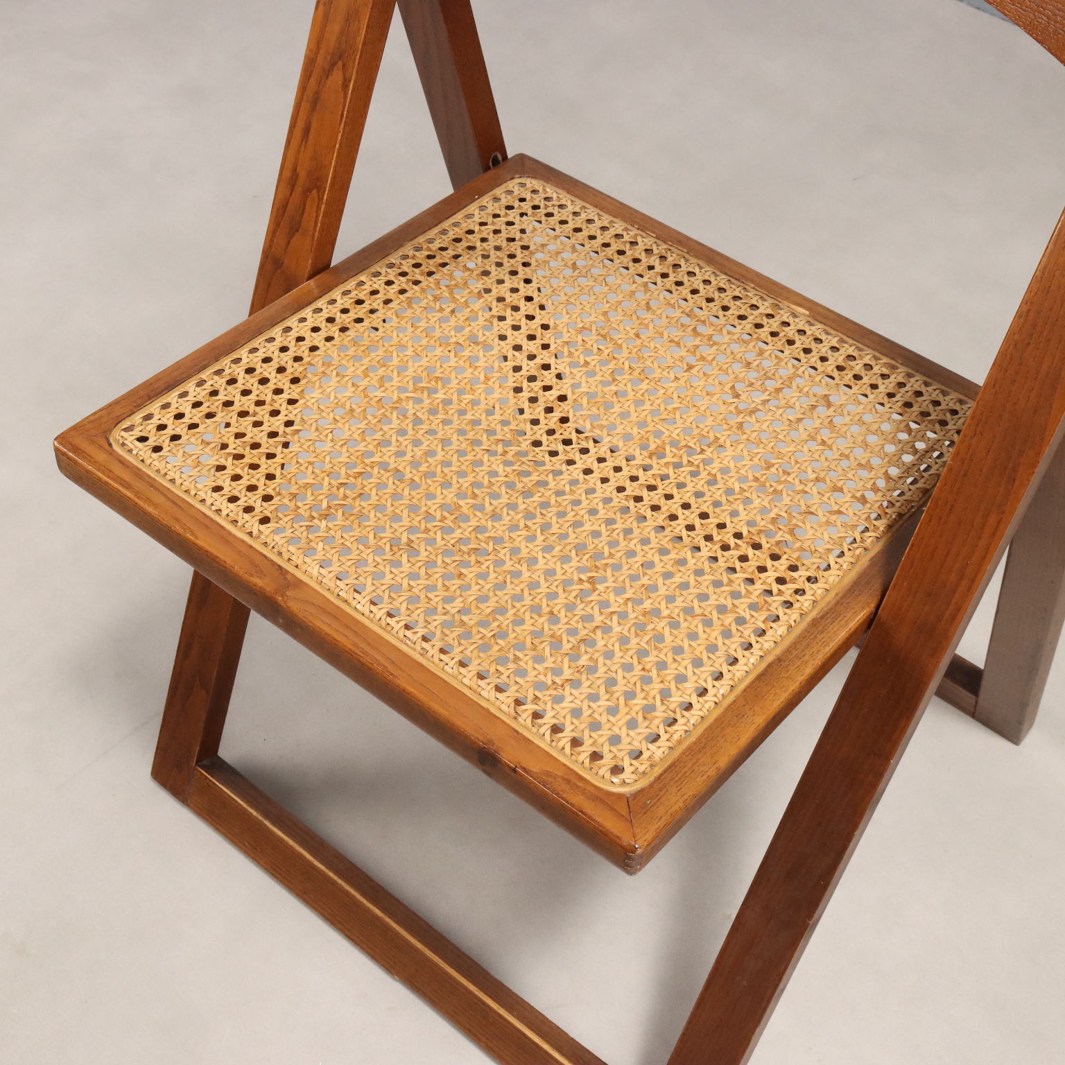 Coppia di sedie pieghevoli con struttura in legno e seduta in paglia di Vienna.