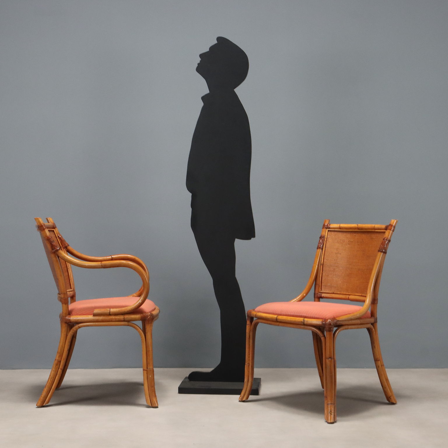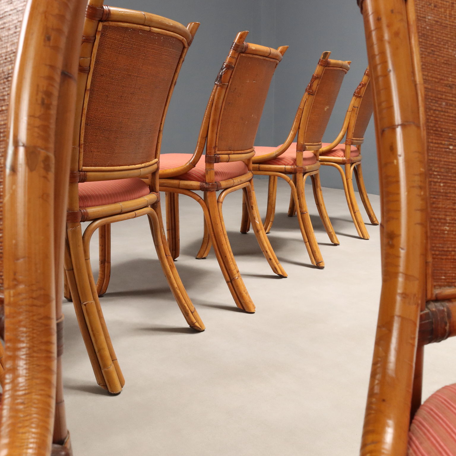 Gruppo di dodici sedie vintage, di cui due capotavola con braccioli, con struttura in bambù, schienale in vimini e seduta con imbottitura in espanso e rivestimento in tessuto originale nei toni del salmone. Sedute pronte per essere rinnovate nella tappezzeria e restaurate nella parte lignea nei nostri laboratori.