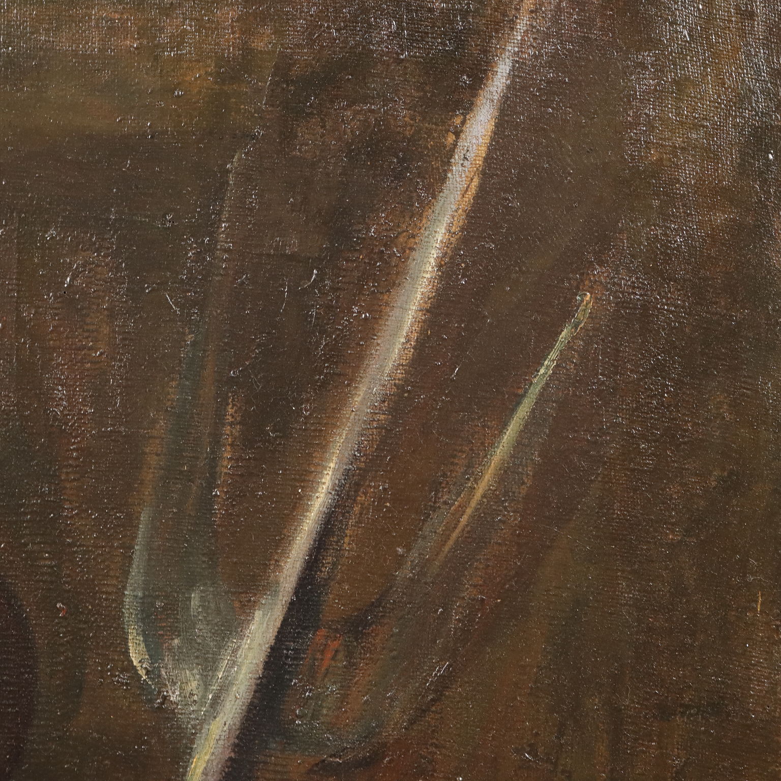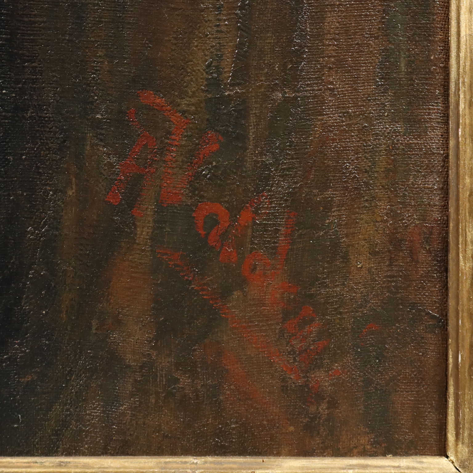 Olio su tela. Firmato in basso a destra. Antonio Valdoni, pittore triestino ma attivo a Milano, si affermò soprattutto come paesaggista. Propone invece in quest' opera una figura di armigero che impugna un tridente: il Valdoni che militò tra le fila garibaldine partecipando alle guerre di Indipendenza, esprime qui tutta la fierezza del soldato, seppur appartenente ad epoca precedente la sua. Il dipinto è stato in passato montato su un telaio nuovo, con rinforzi alla tela. È presentato in cornice costruita con elementi di cornici di fine '800.