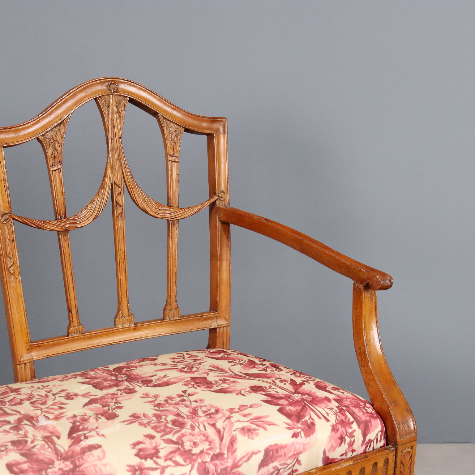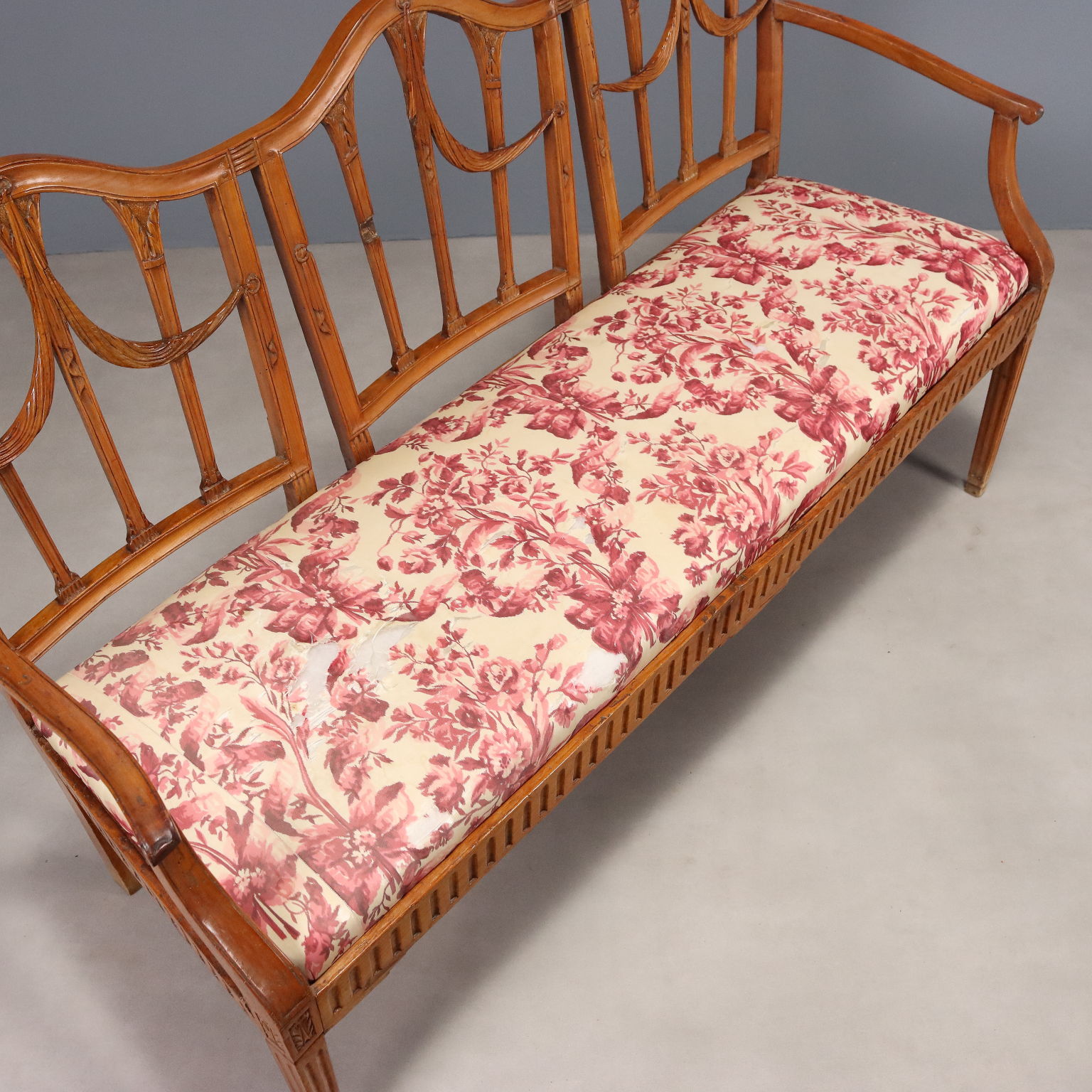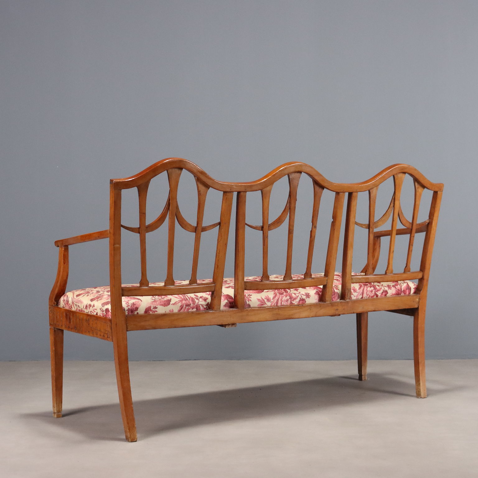 Divanetto da portego in stile neoclassico degli inizi dell'800. Realizzato in acero intagliato, probabilmente inizialmente dipinto e portato poi a legno in un secondo momento. Gambe a tronco di piramide con intagli a sgorbiatura anche nella fascia, schienale a giorno con motivo intagliato a tendina di gusto inglese.