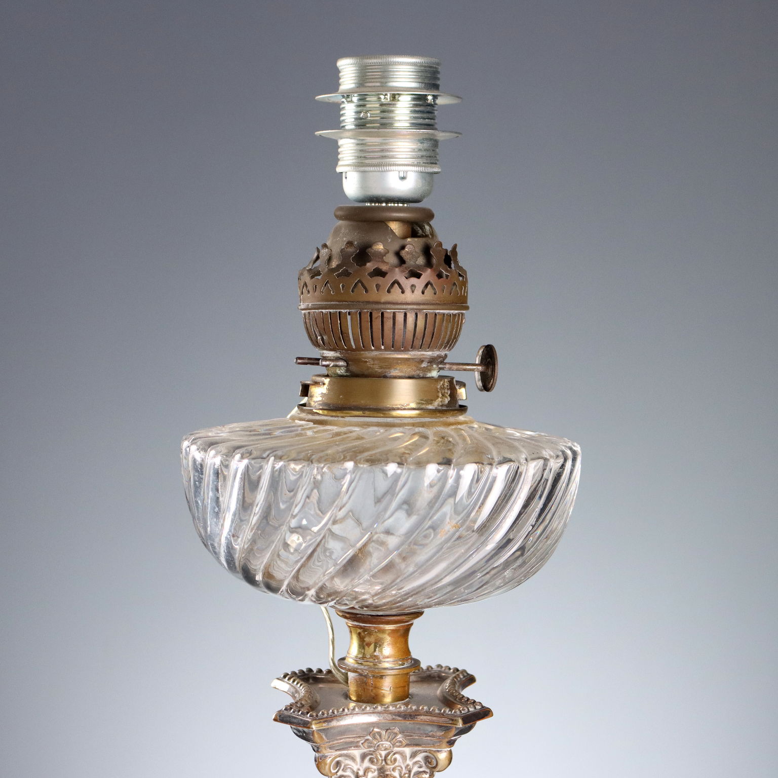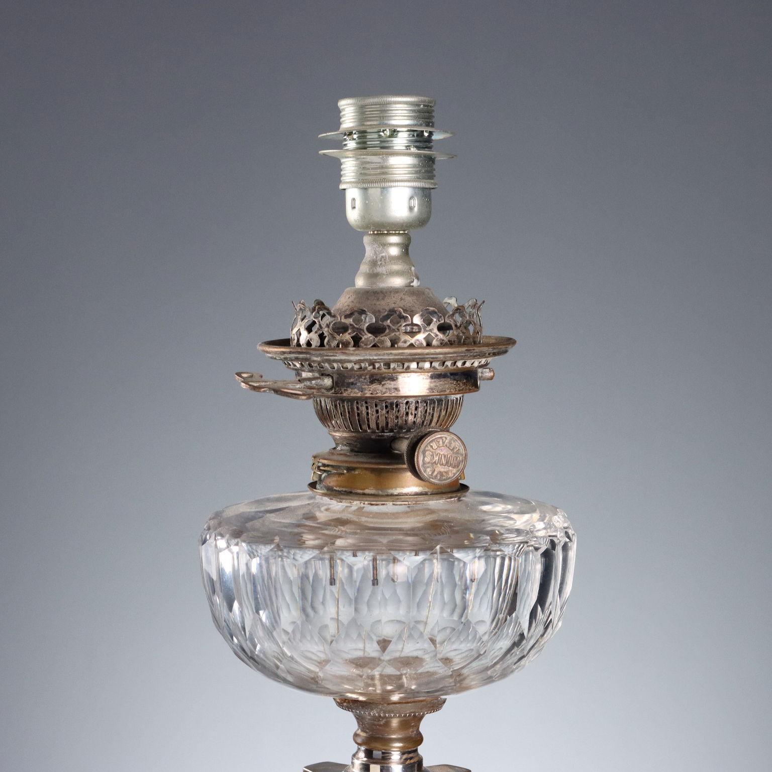 Gruppo di tre lampade da appoggio in metallo argentato, sbalzato e cesellato. Corpo a foggia di colonna con capitello corinzio sovrastato da boule in vetro. Marchio della manifattura incusso sulla base di una delle tre.