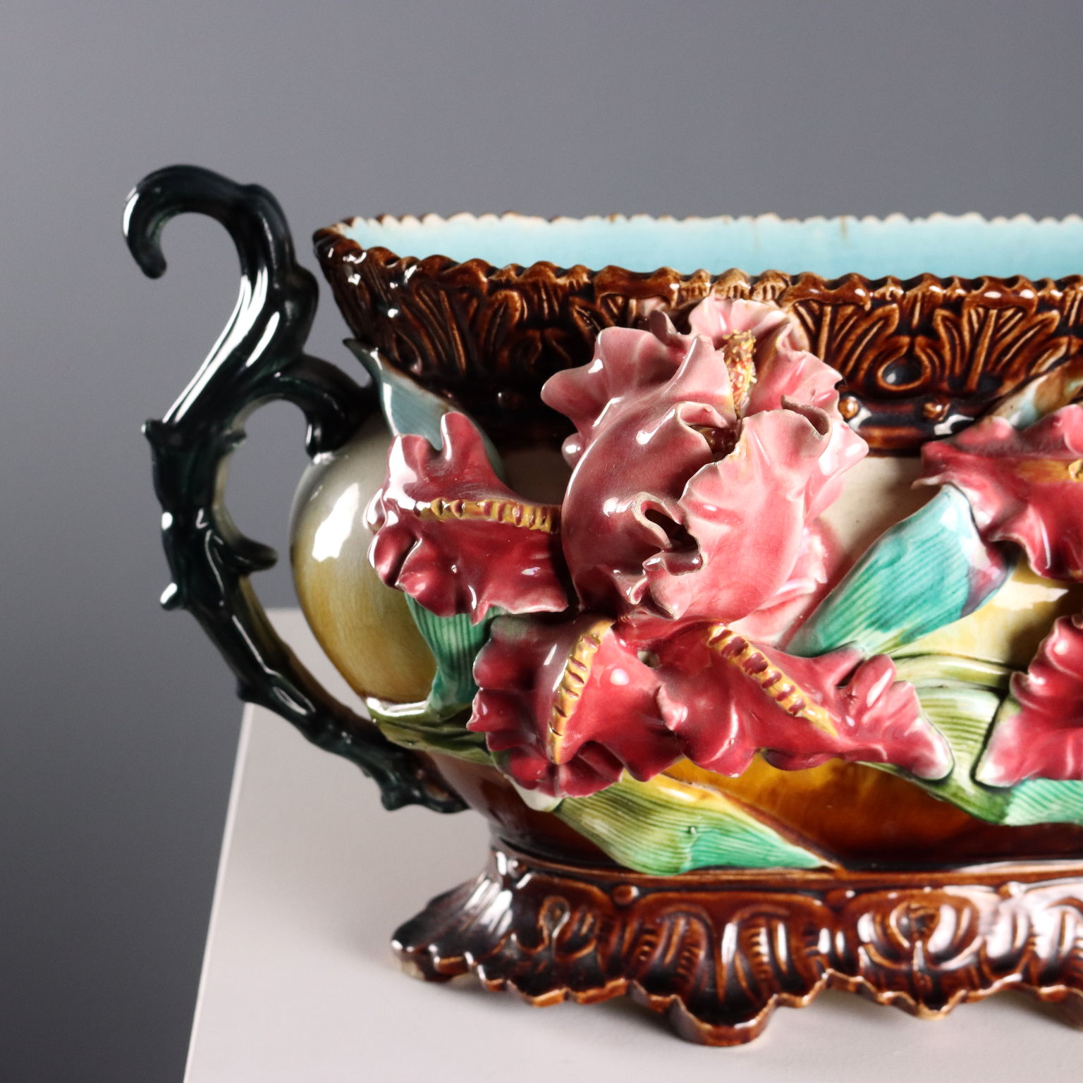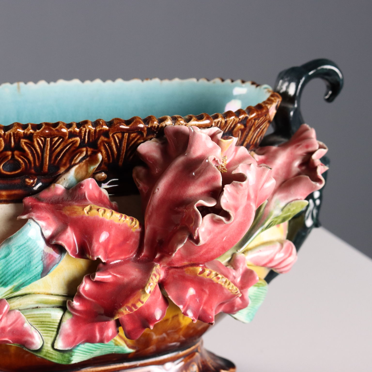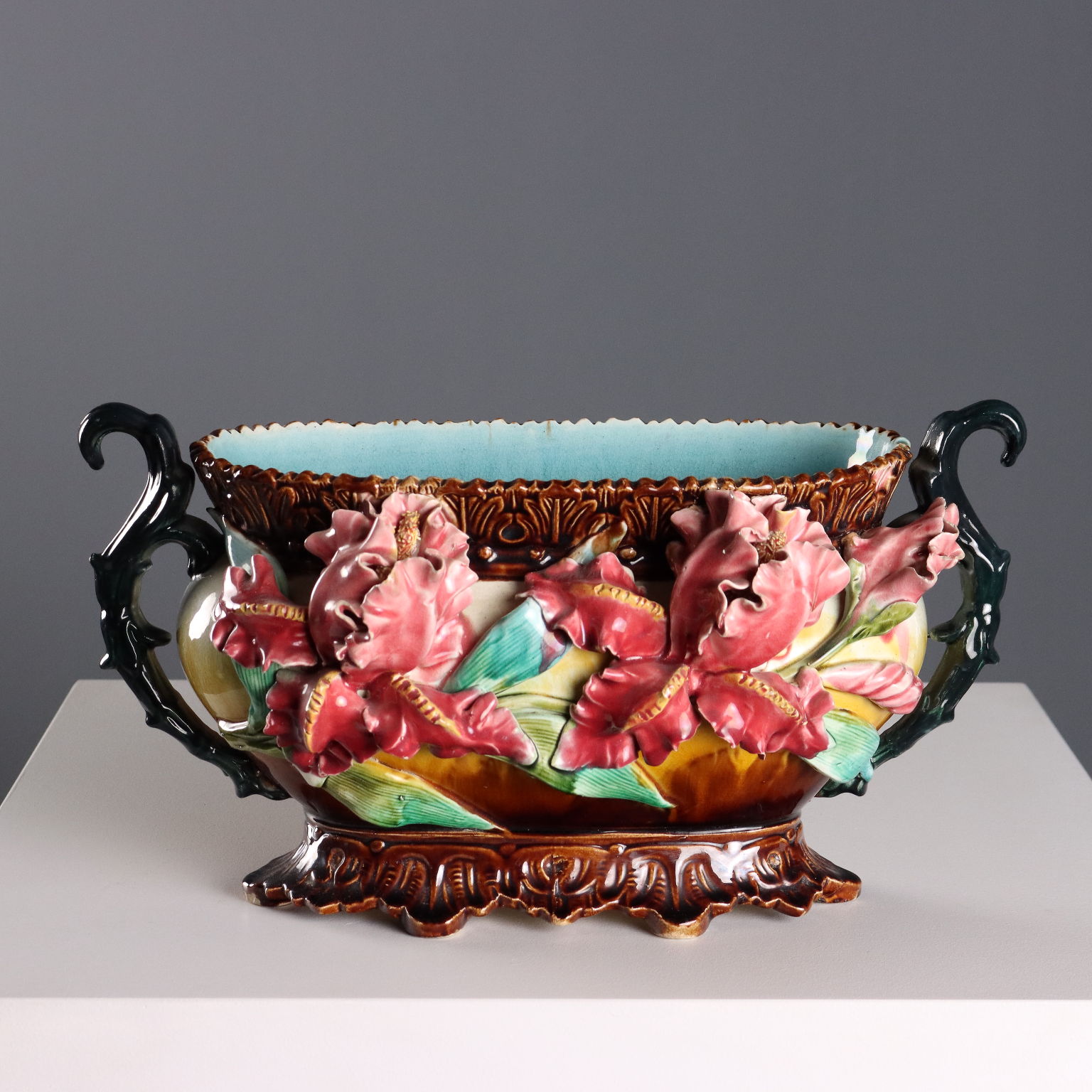 Fioriera in ceramica policroma con anse a volute e decoro applicato a fiori e foglie.