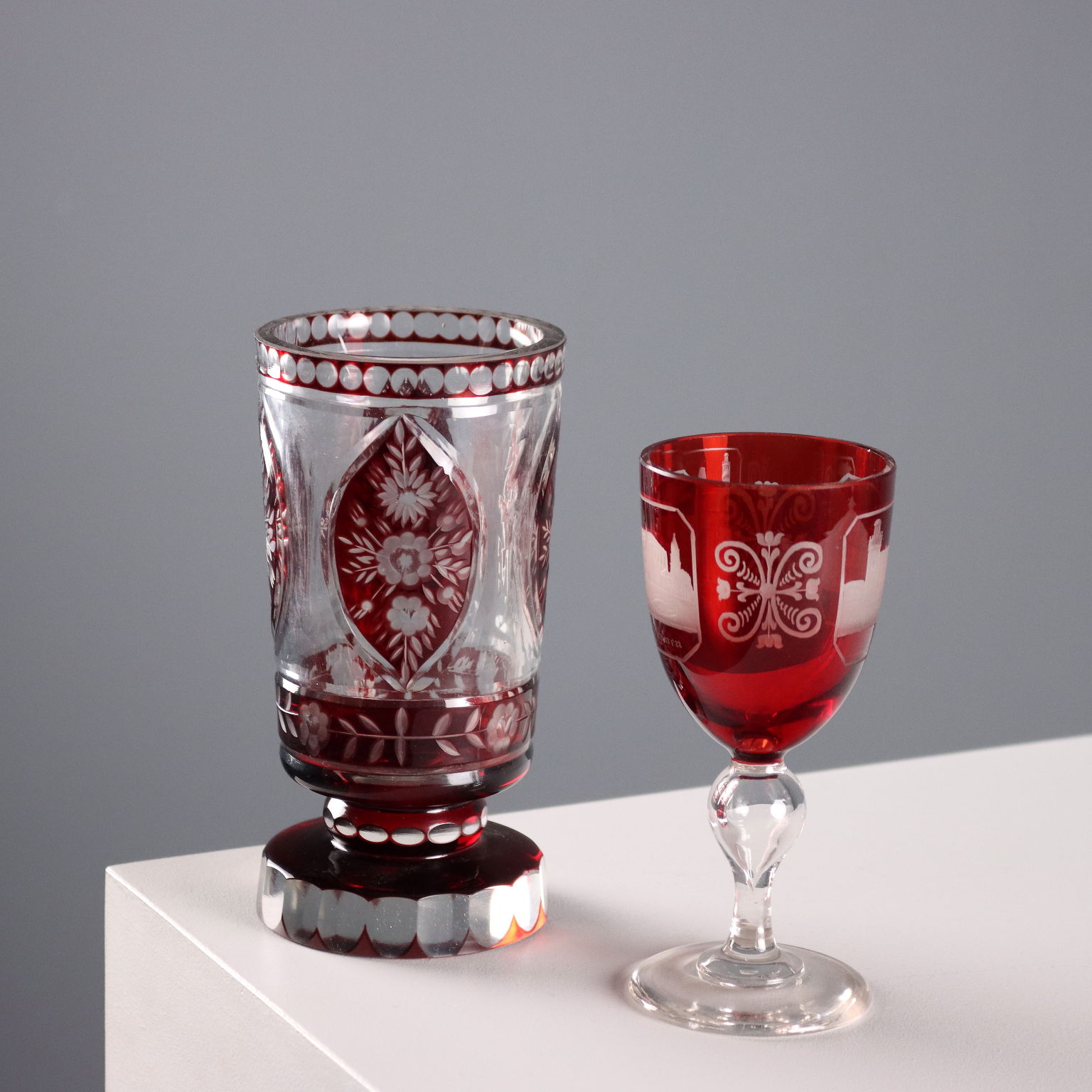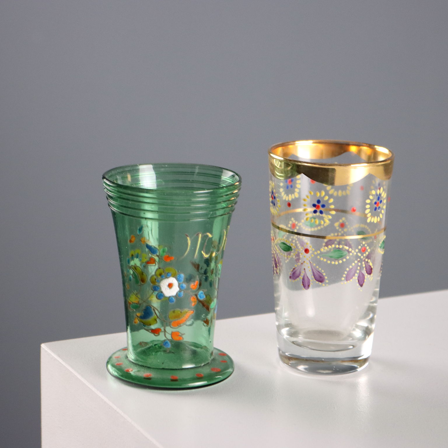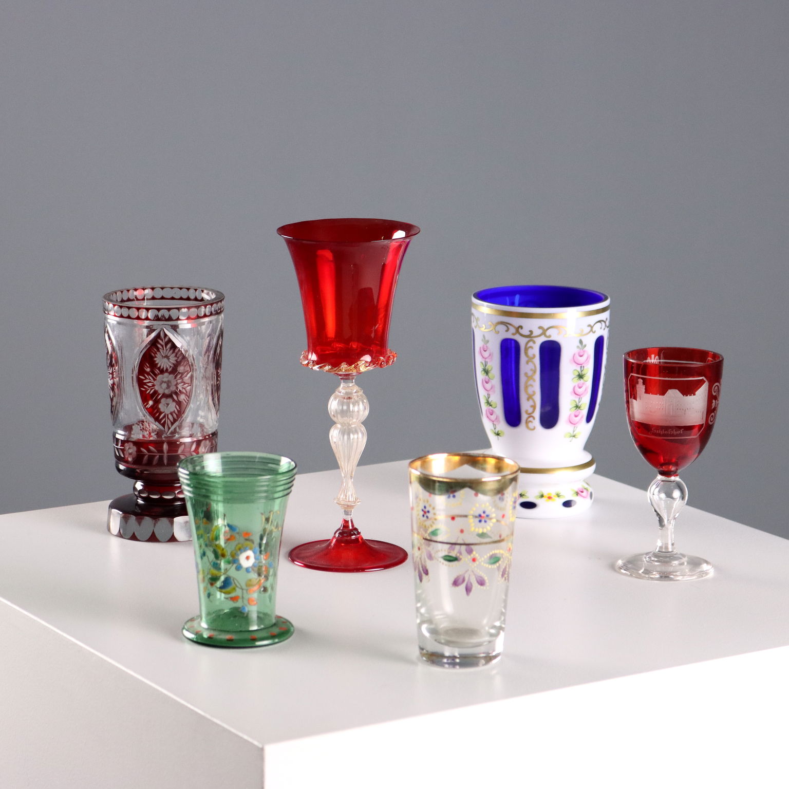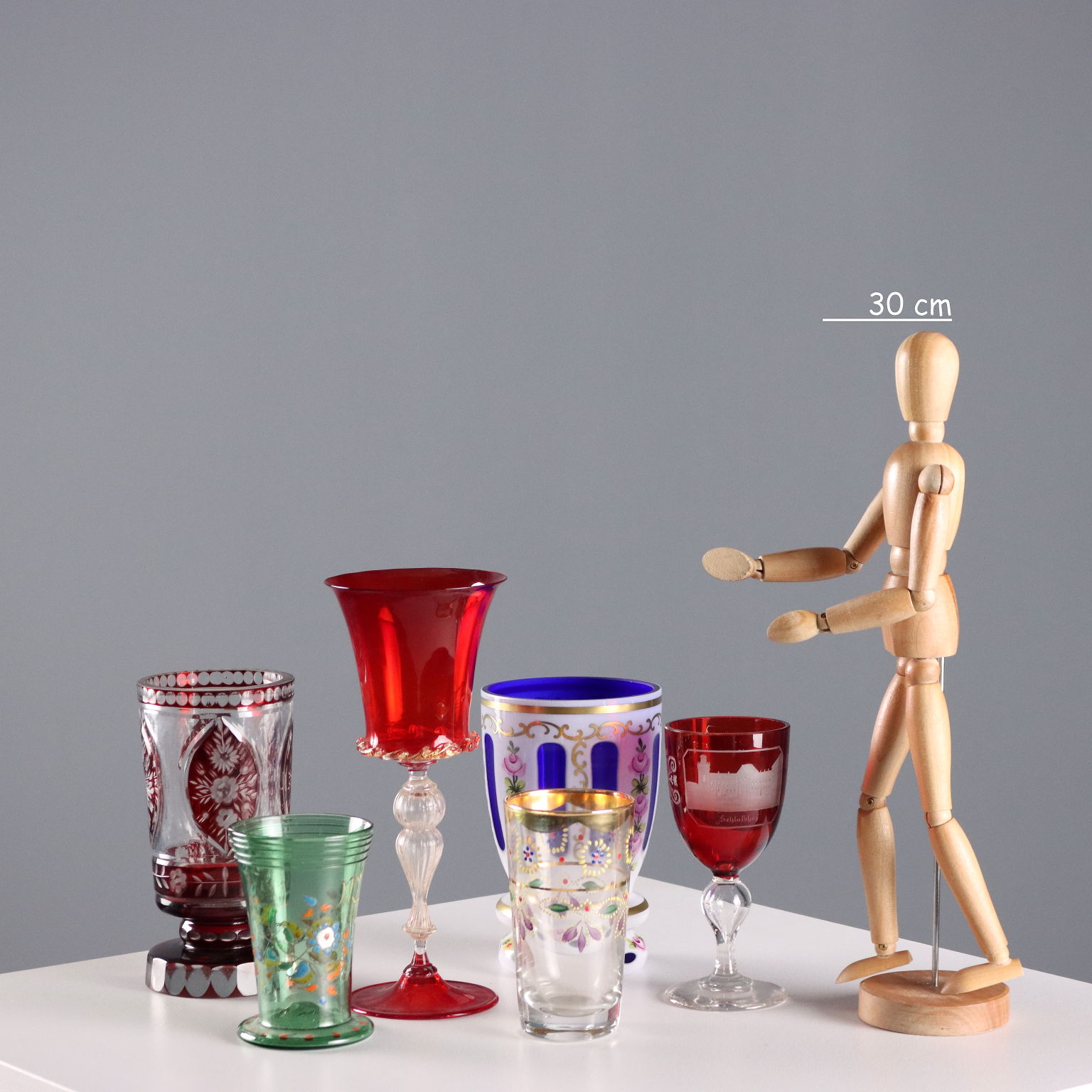 Gruppo di sei bicchieri in vetro soffiato e in vetro molato e inciso di diverse manifatture, forme e colori.
