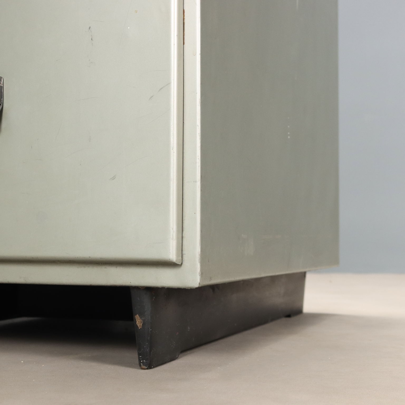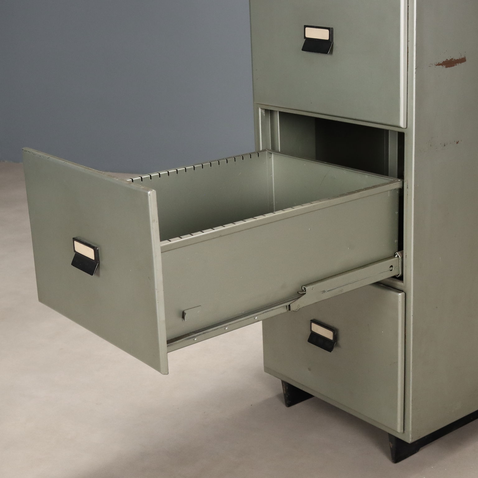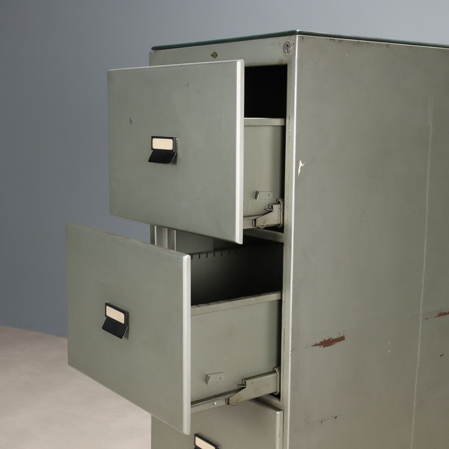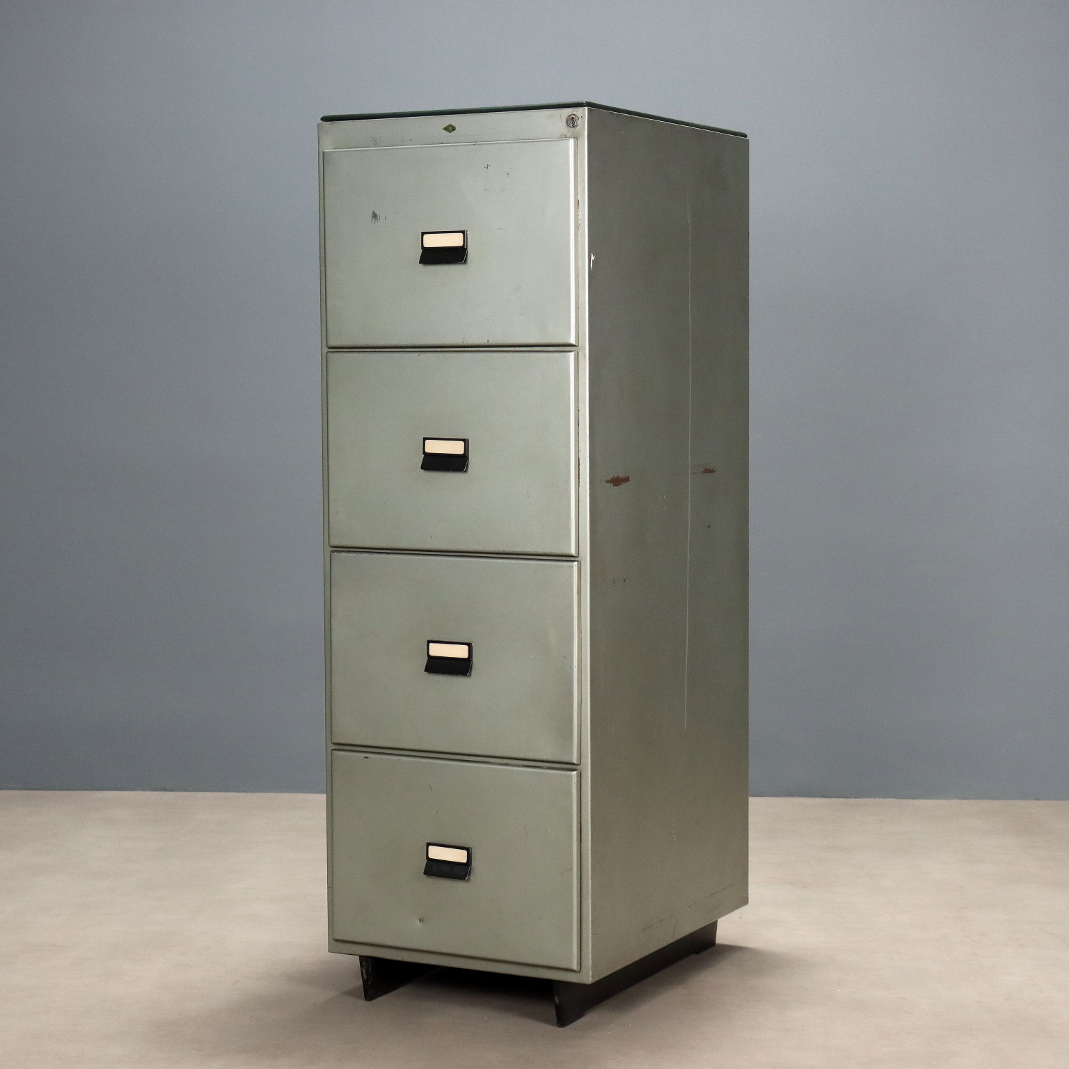 Mobile schedario vintage realizzato in metallo grigio con quattro cassetti.