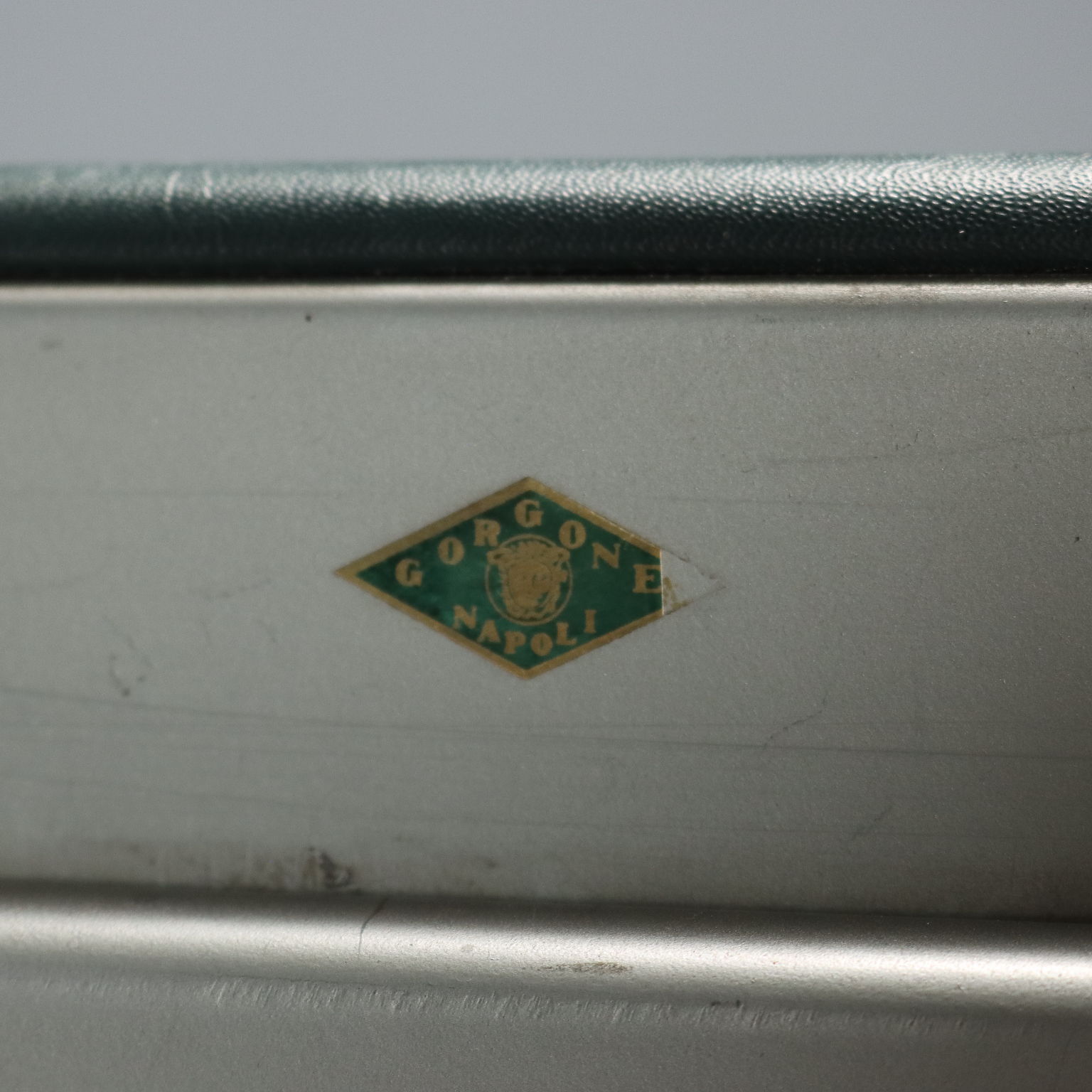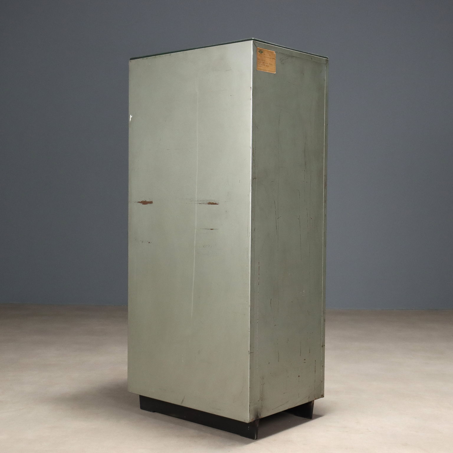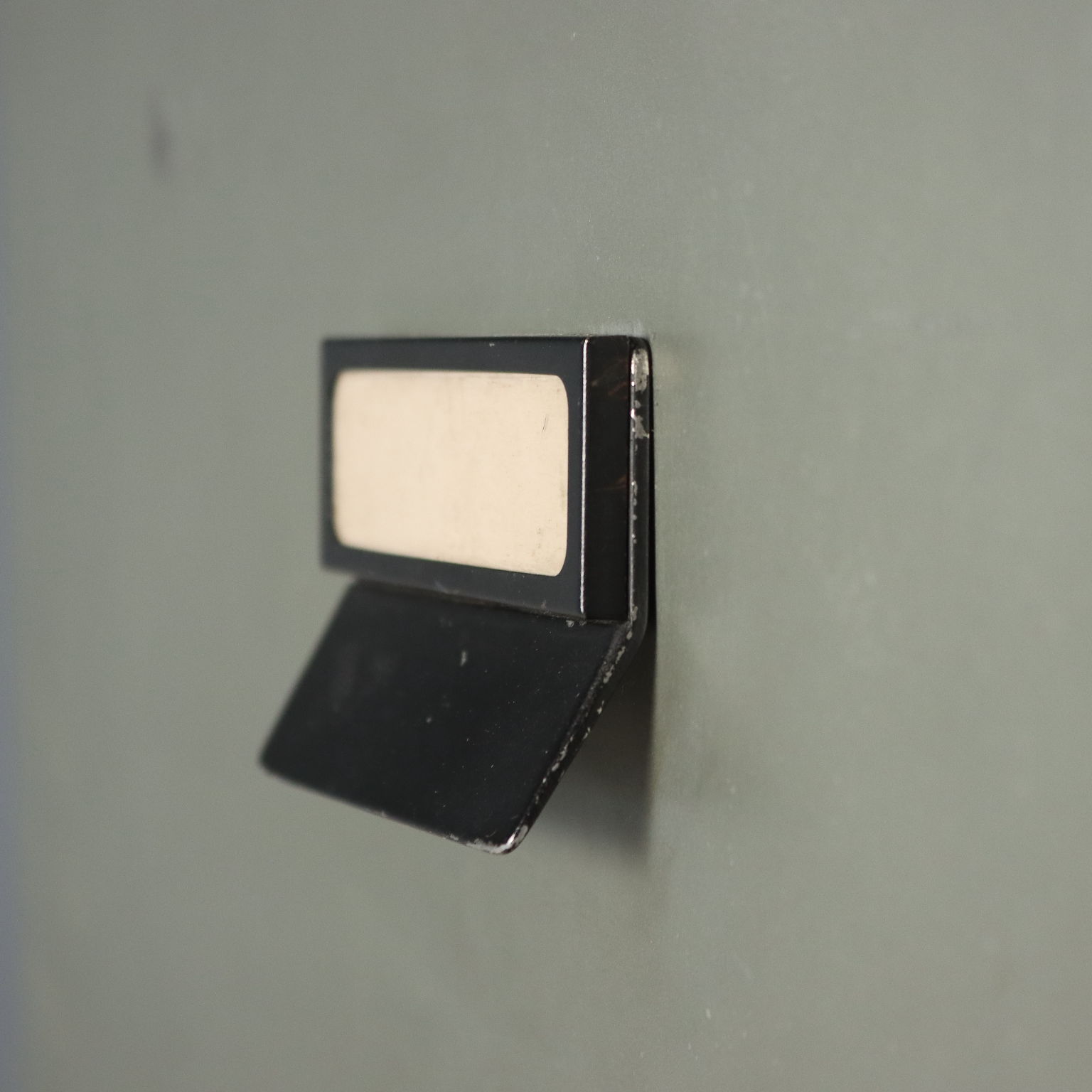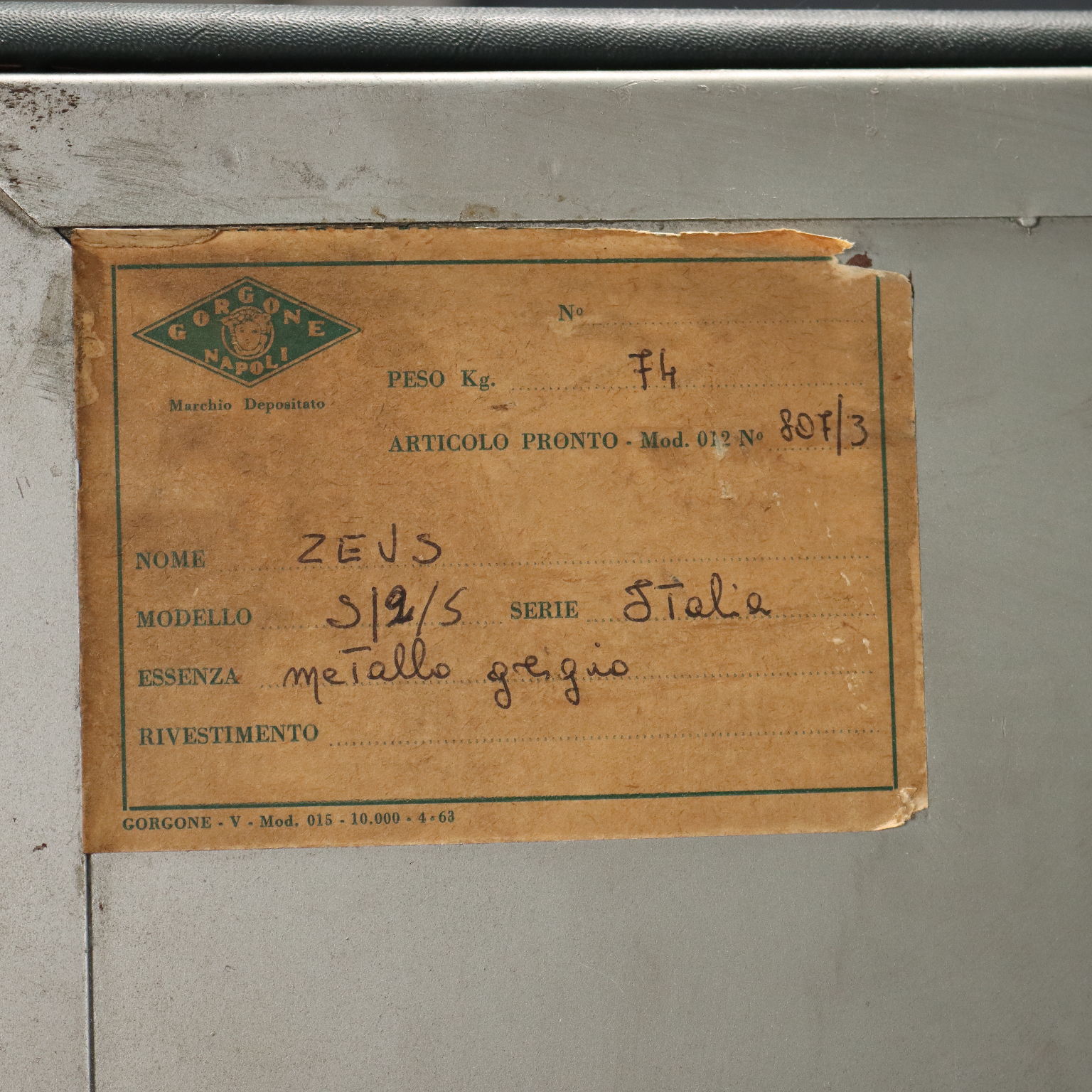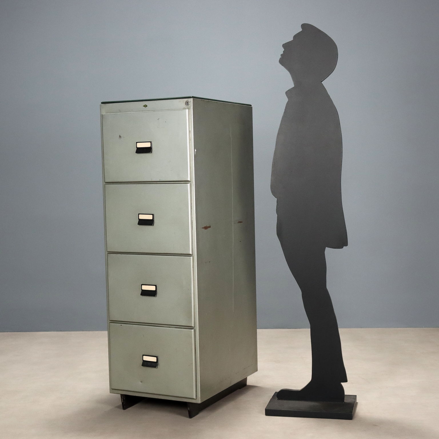 Mobile schedario vintage realizzato in metallo grigio con quattro cassetti.