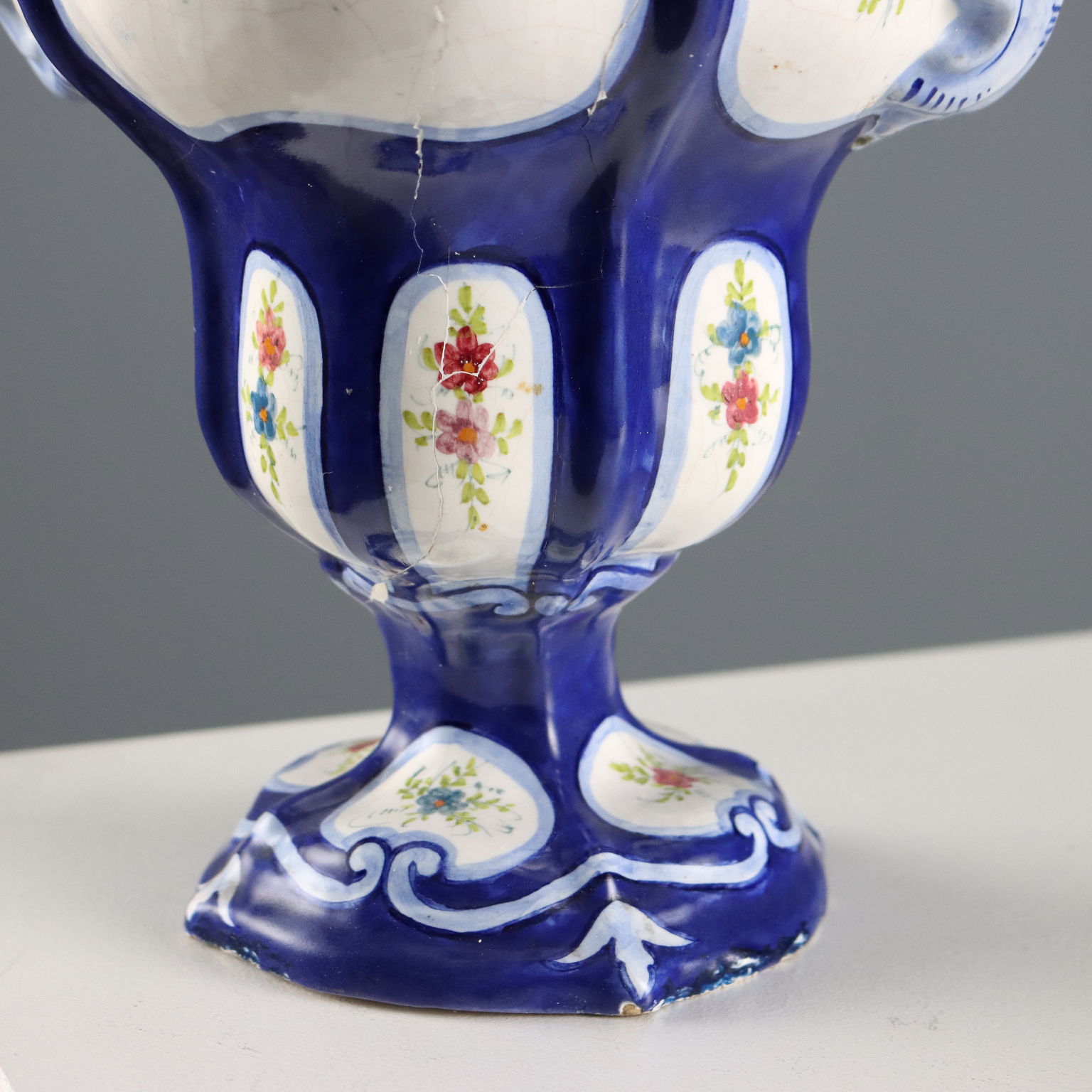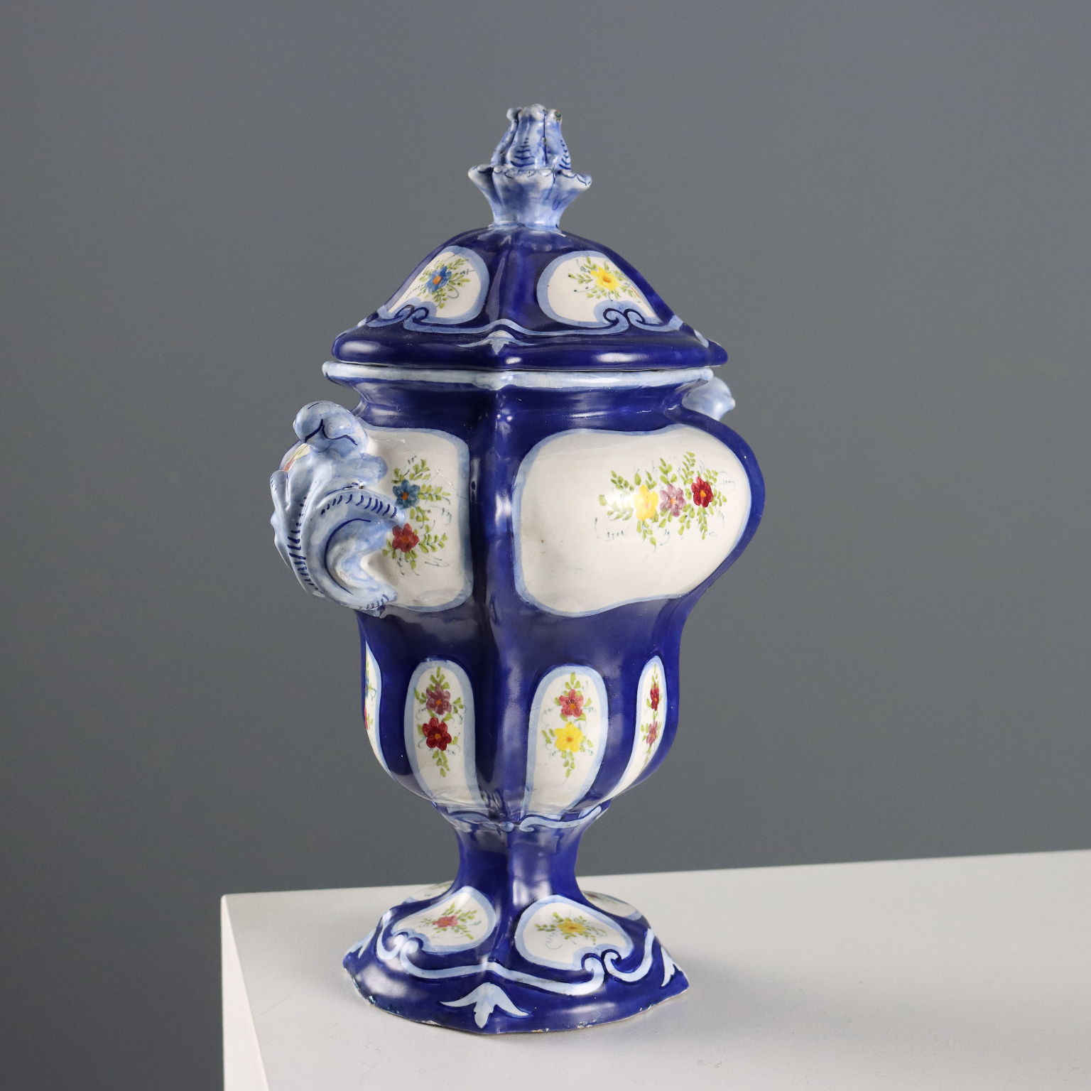 Albarello da farmacia in ceramica con corpo baccellato e decori a fiori policromi. Sotto la base marchio della manifattura.
