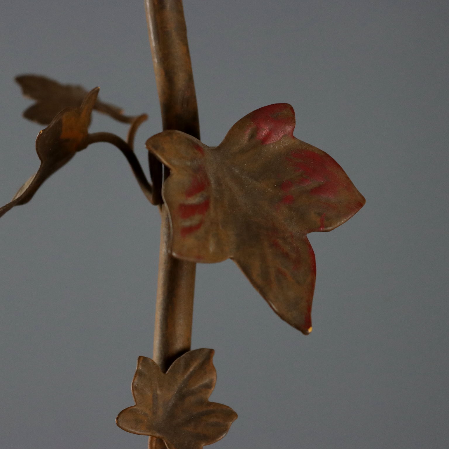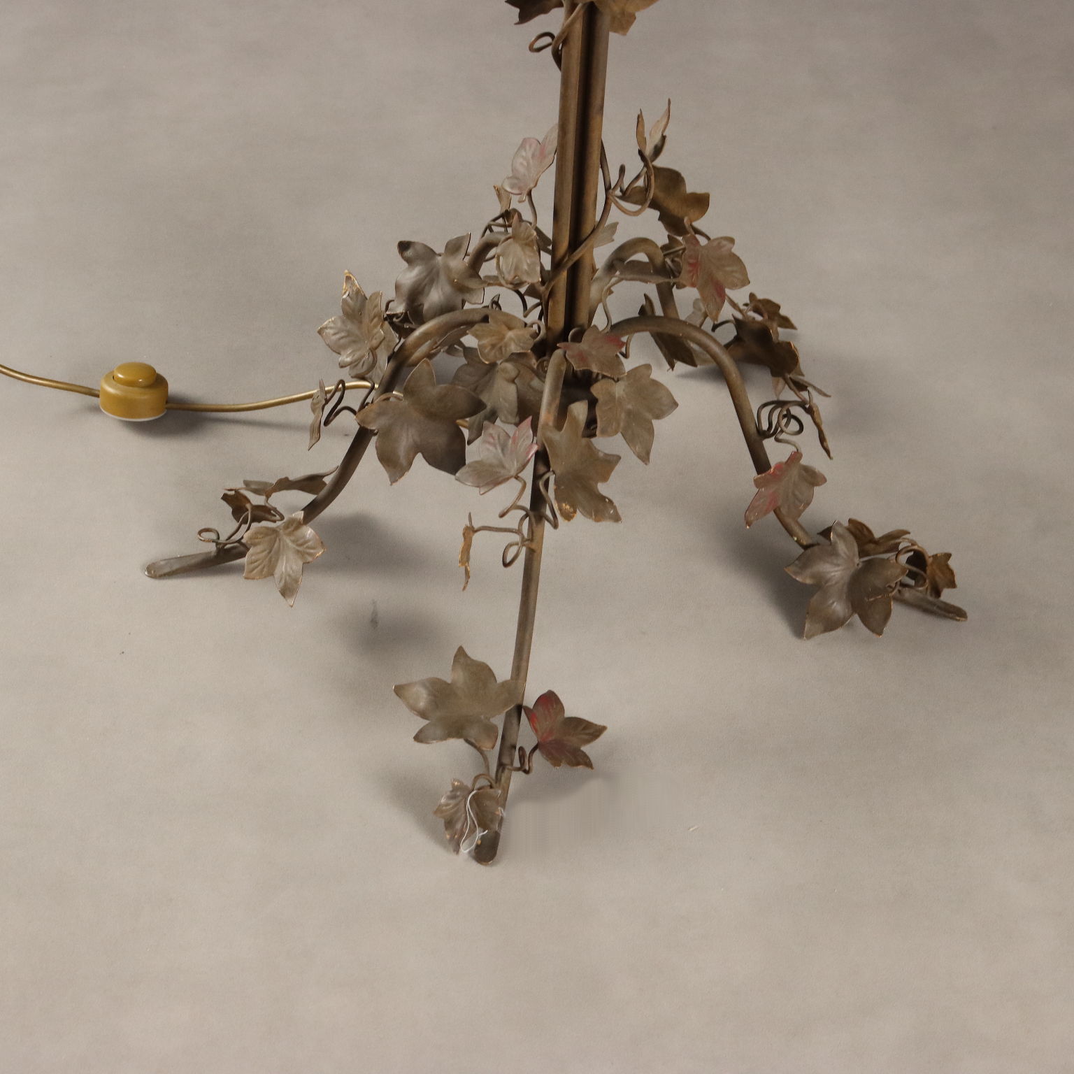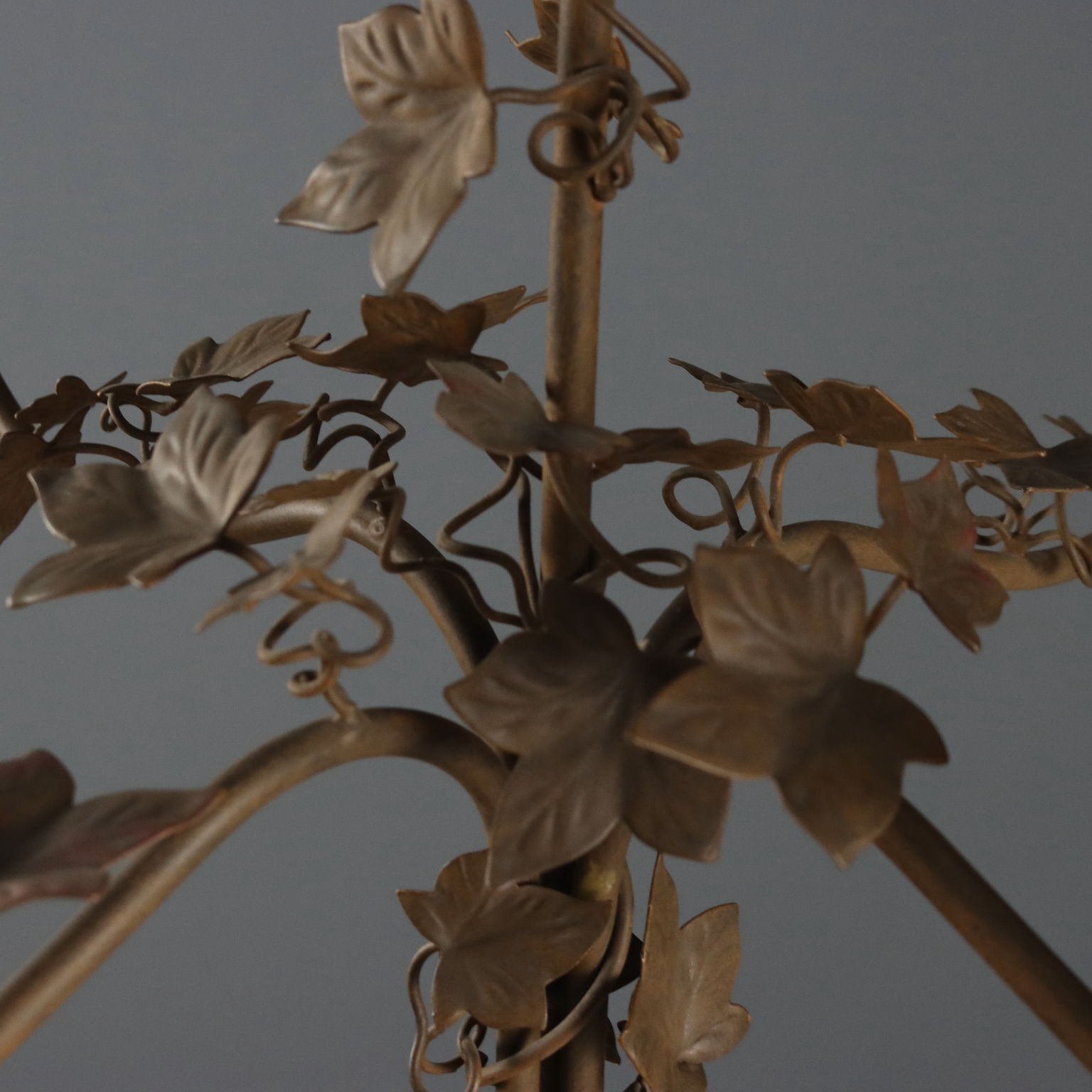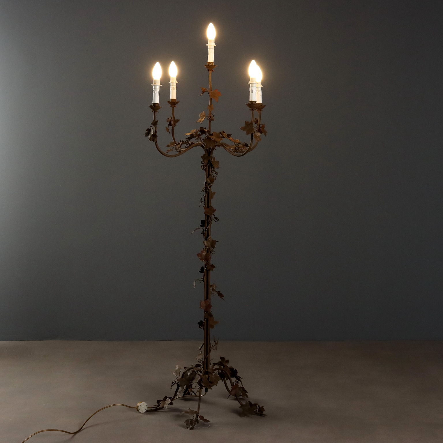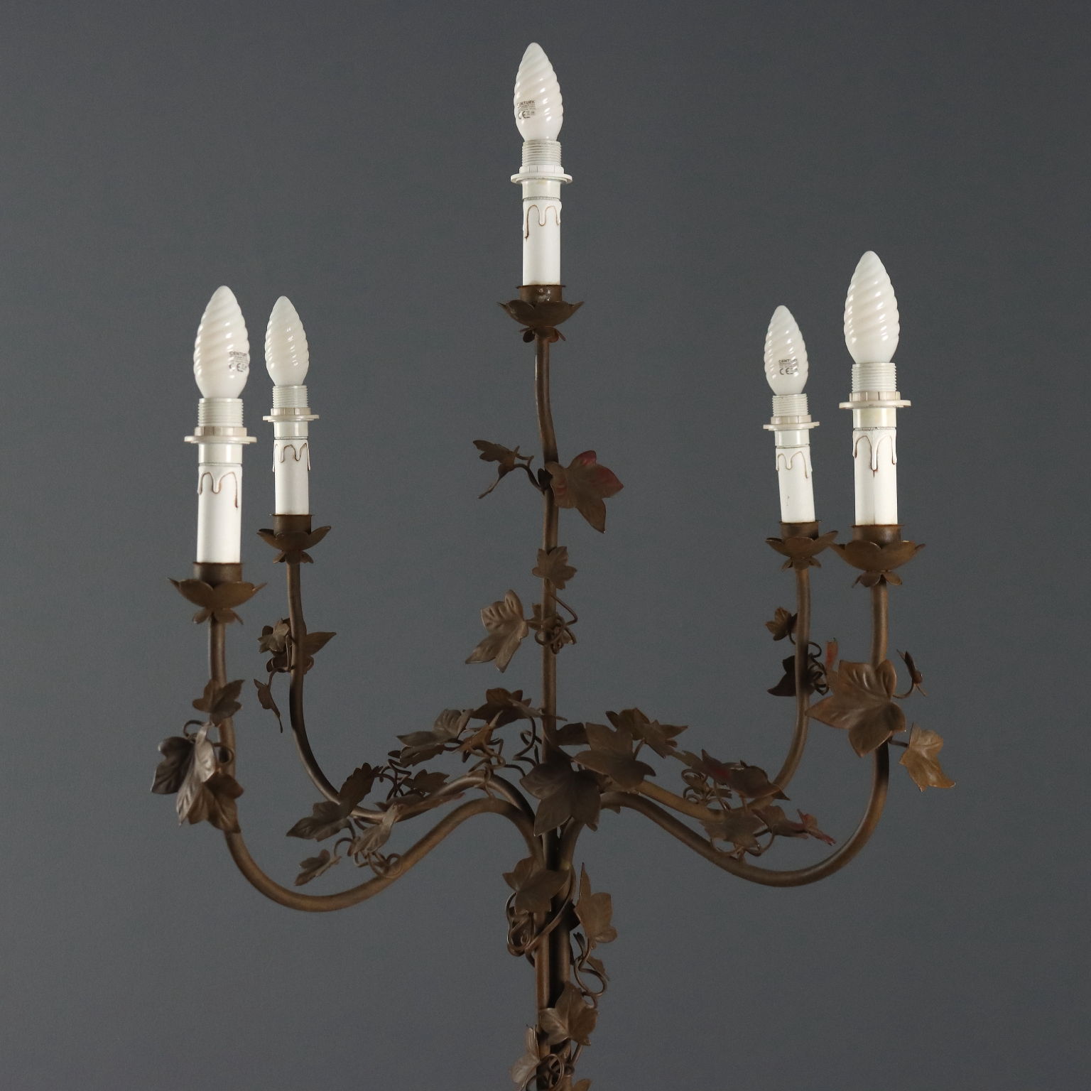 Torciere in ferro a cinque luci, una centrale e quattro sorrette da braccia mosse. Applicazioni in lamierino lavorato a foglie d'uva su tutta la superficie. 5 lampadine E14 Italia, XX Secolo.
