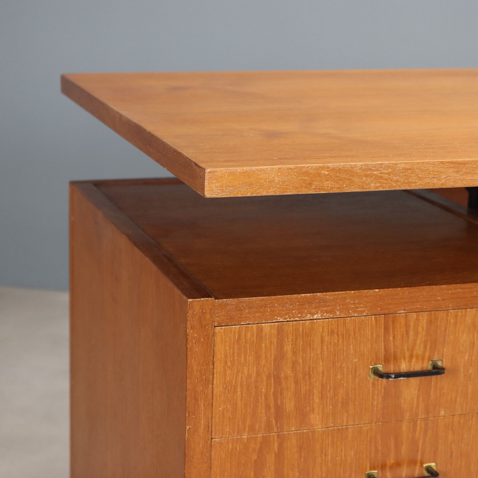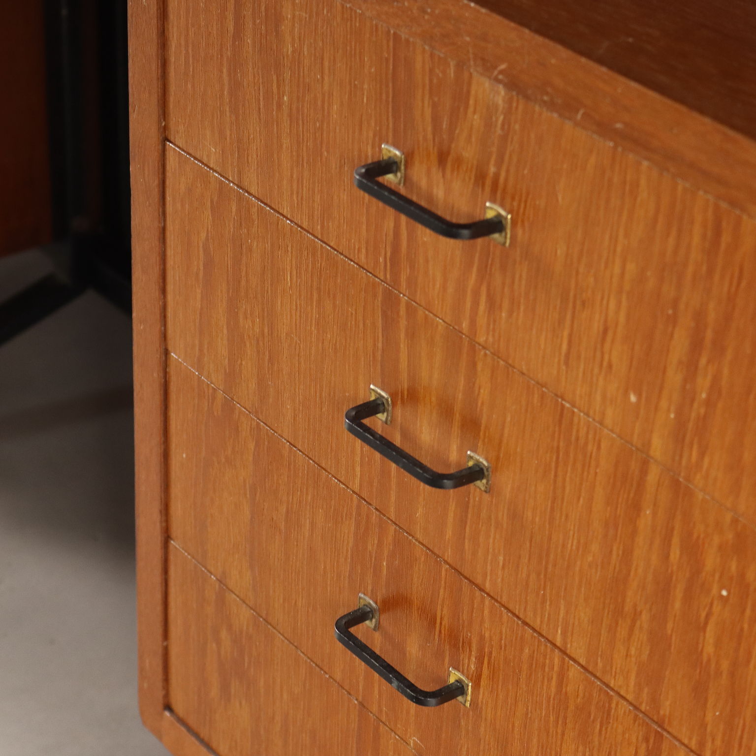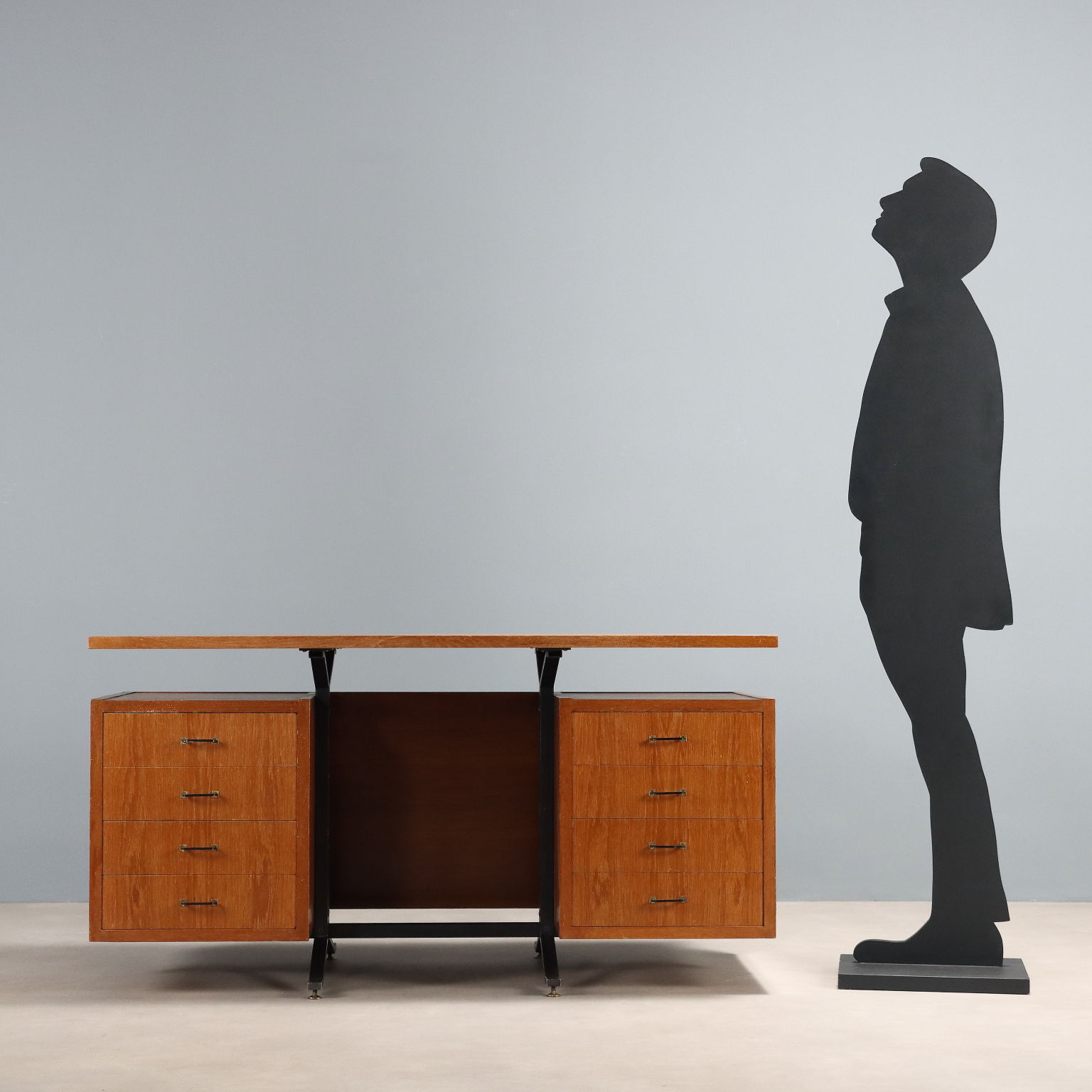 Scrivania con doppia colonna cassetti laterali, struttura in metallo smaltato, legno impiallacciato teak.