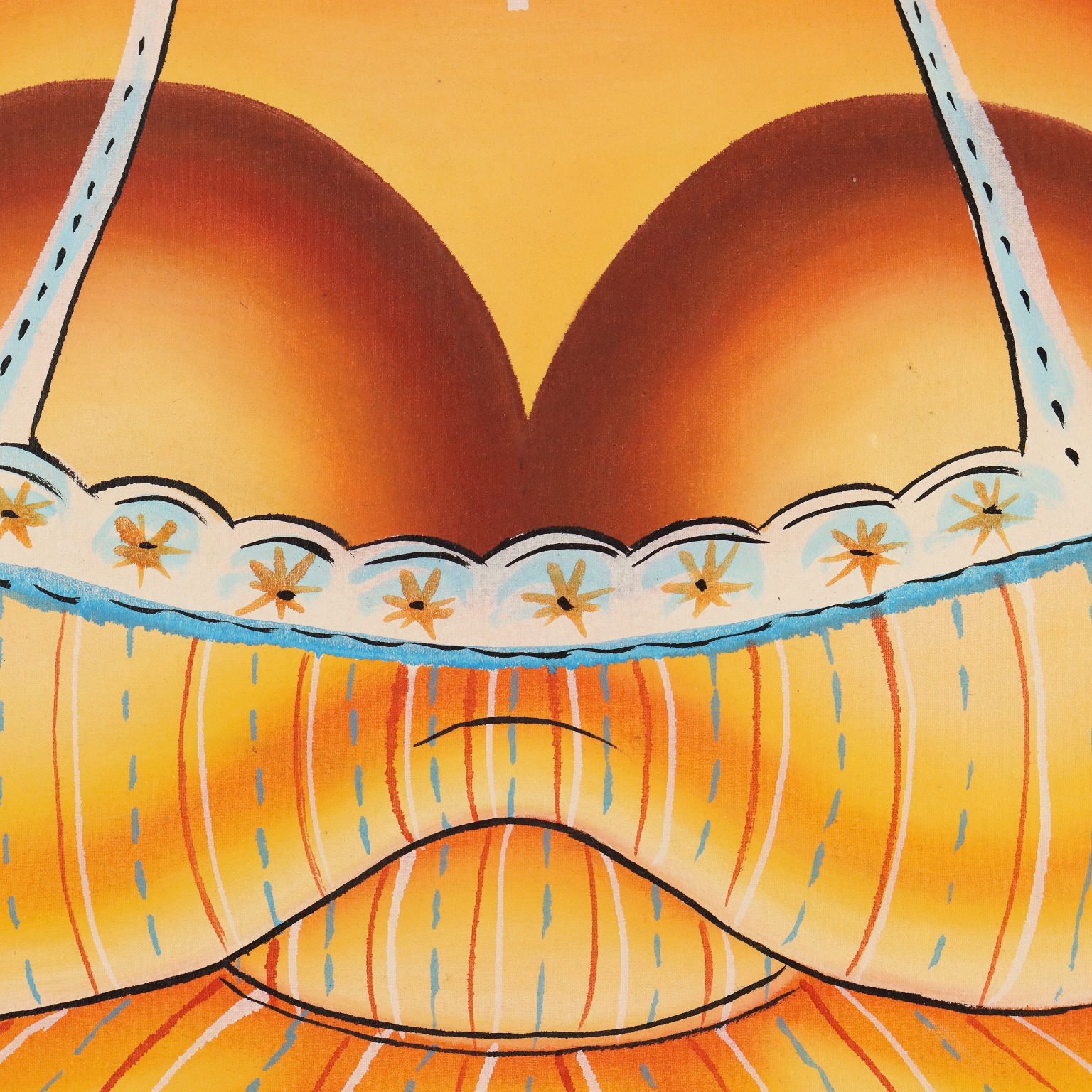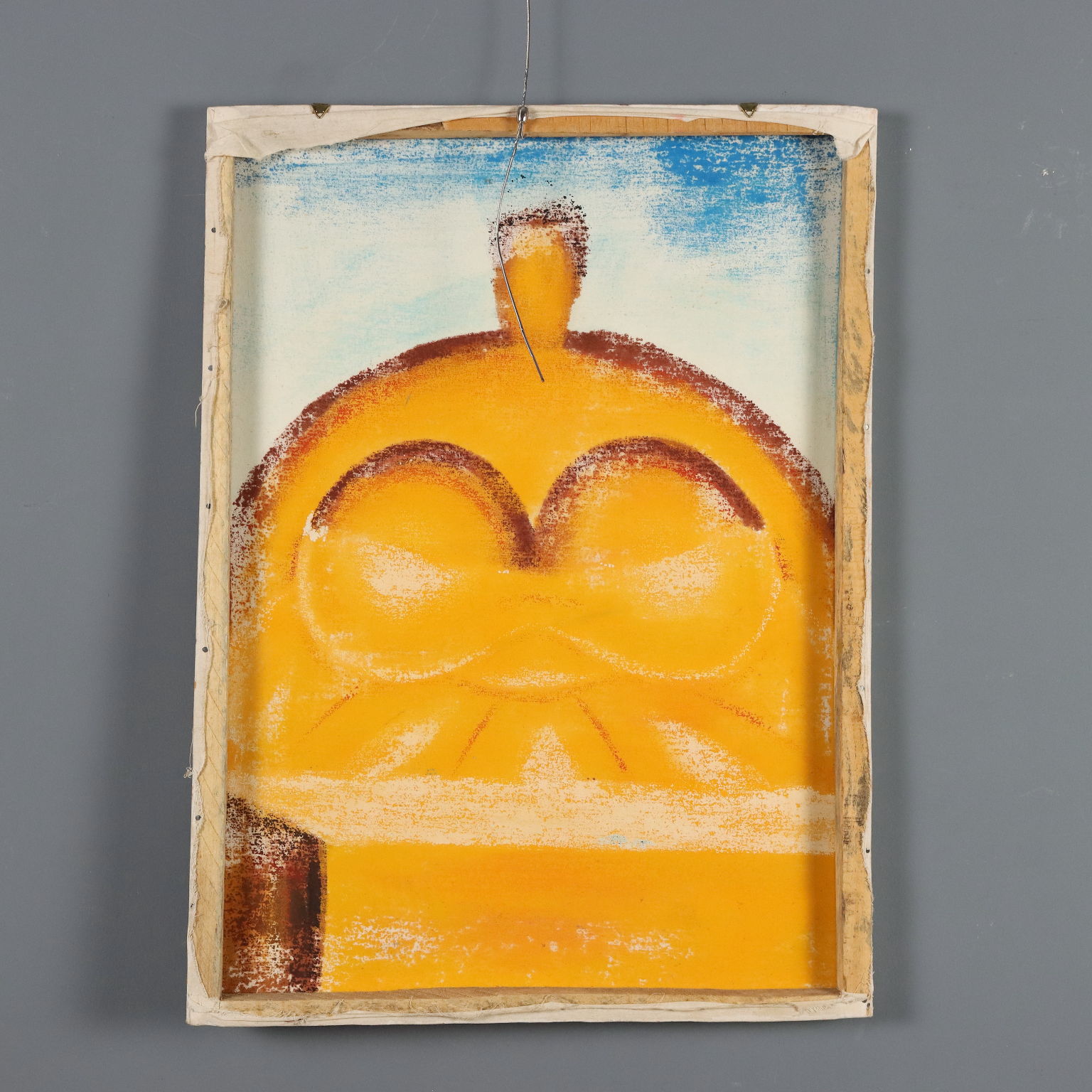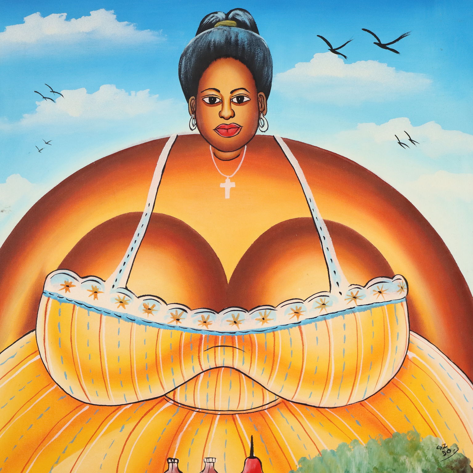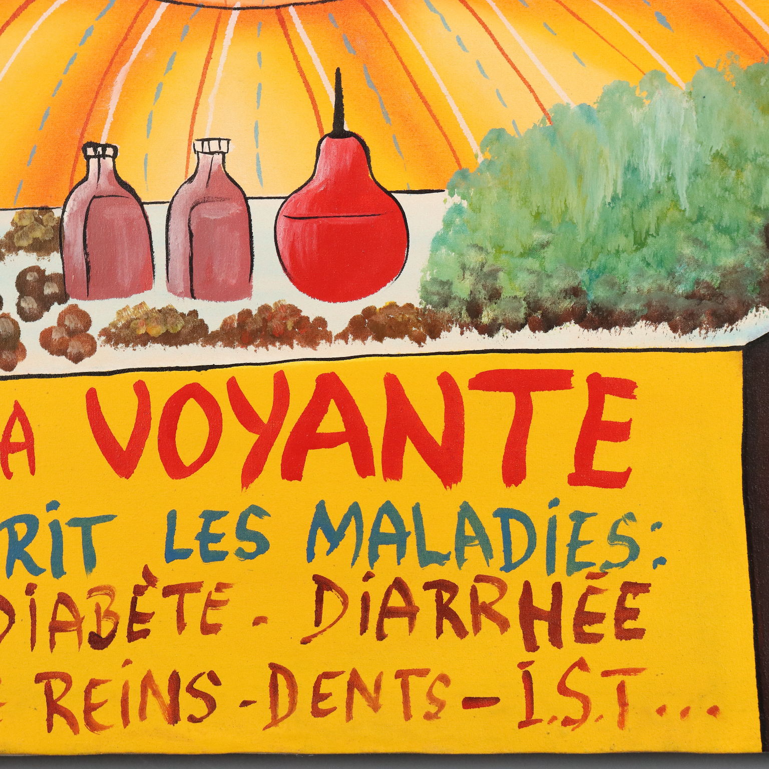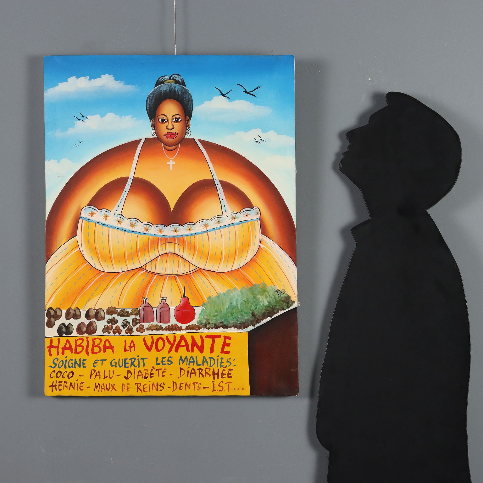 Olio su tela. Africa occidentale. Il dipinto in stile naif raffigura una venditrice di erbe mediche, che con un cartello indica quali malattie guarisce. Questo tipo di dipinti, usati spesso come pubblicità per le bancarelle del mercato, rimandano ai valori tradizionali africani di maternità, fertilità e prosperità, ma trasposti in un contesto culturale contemporaneo.