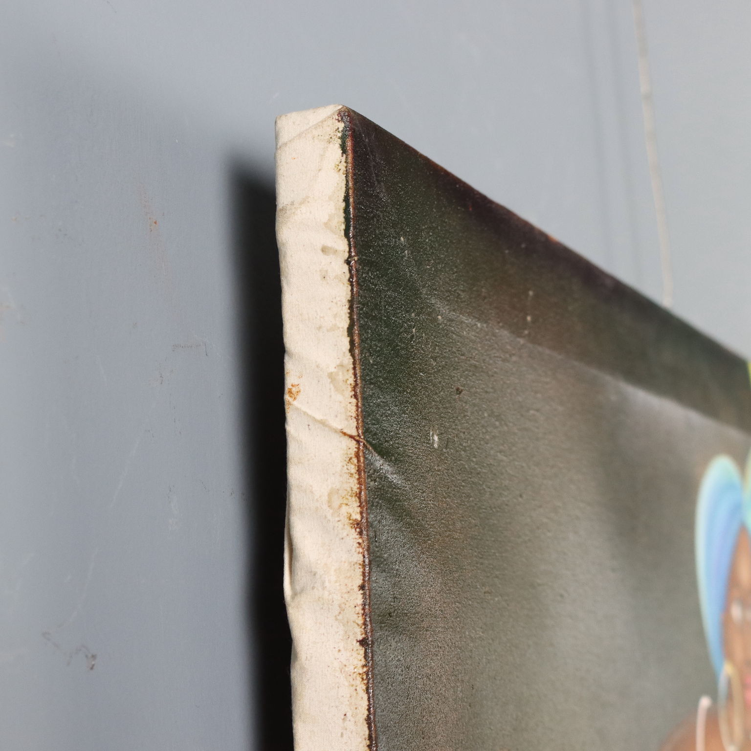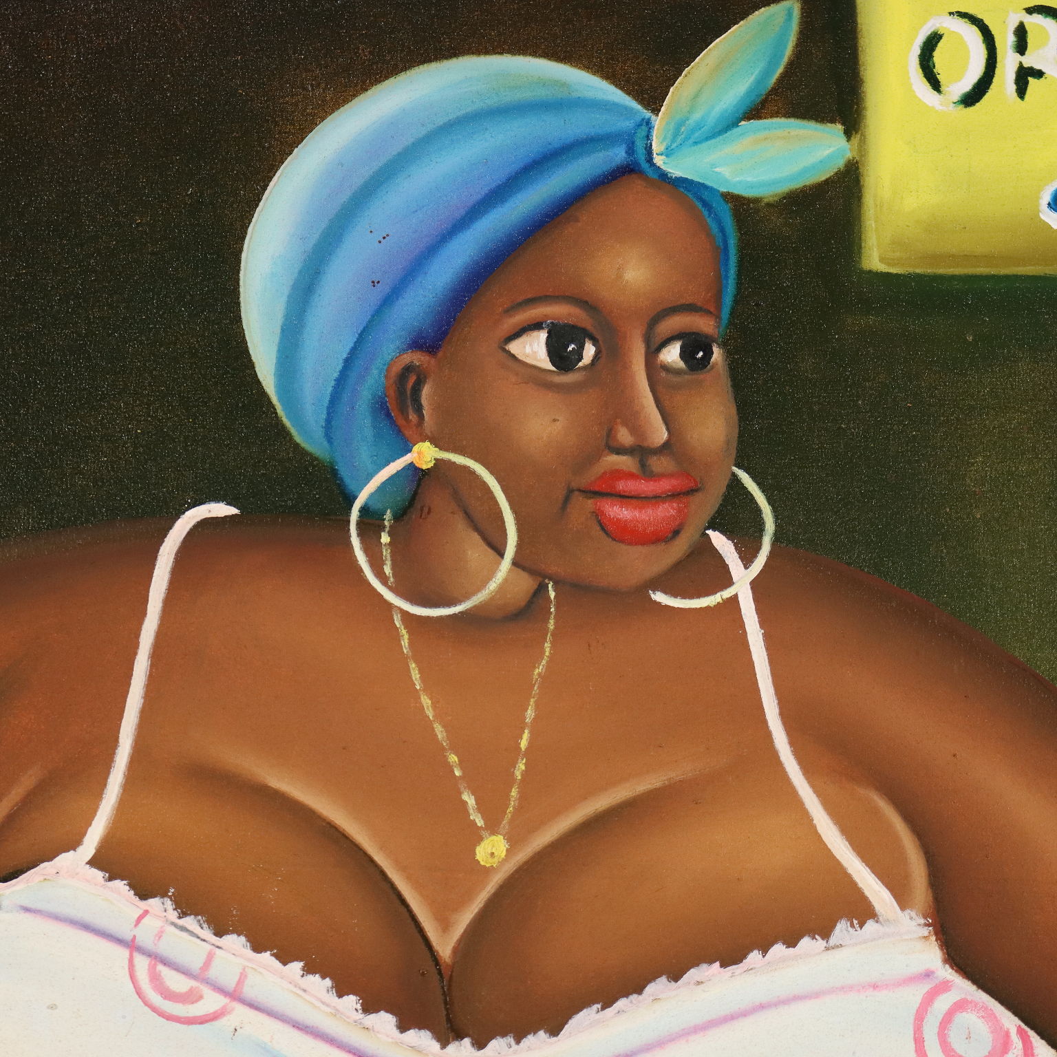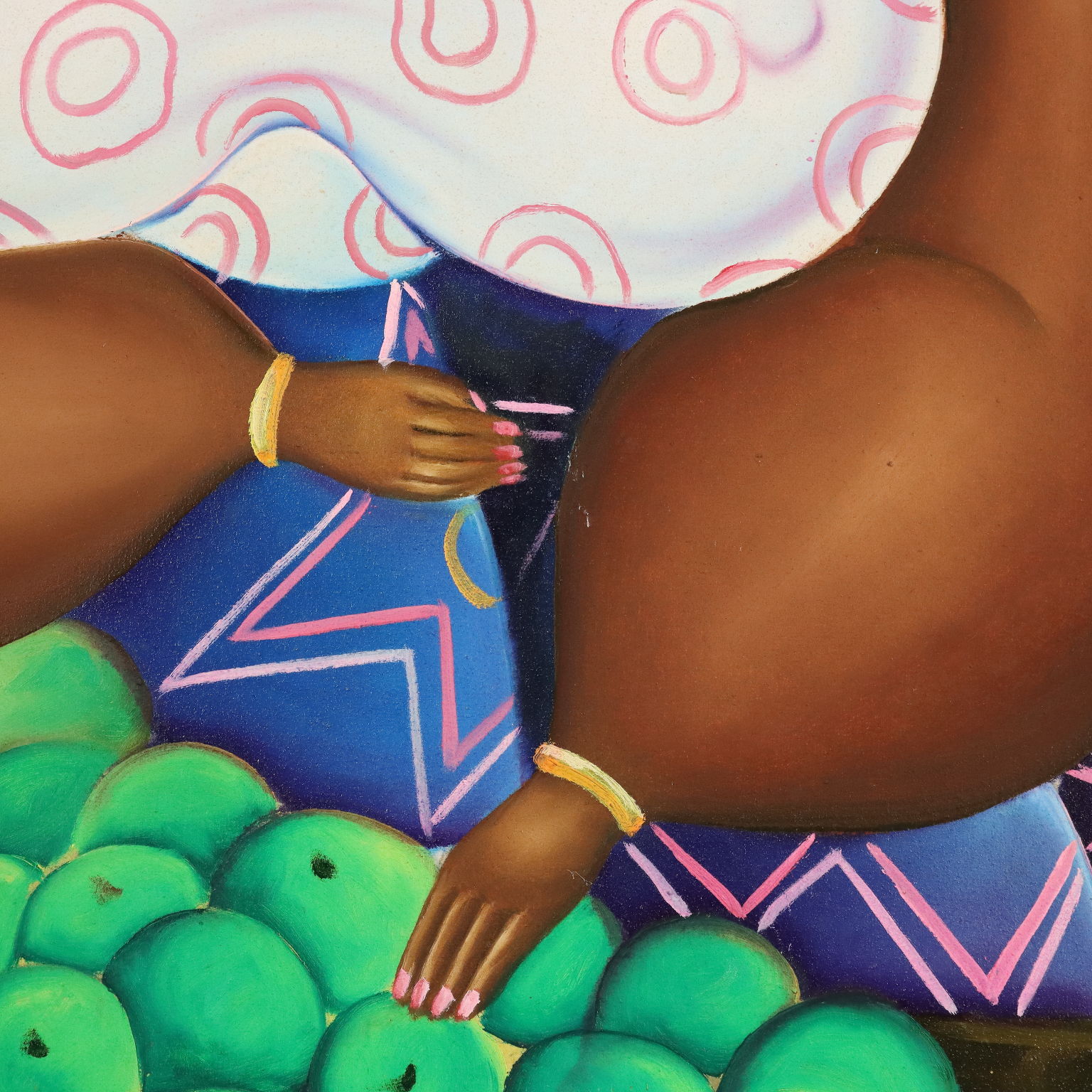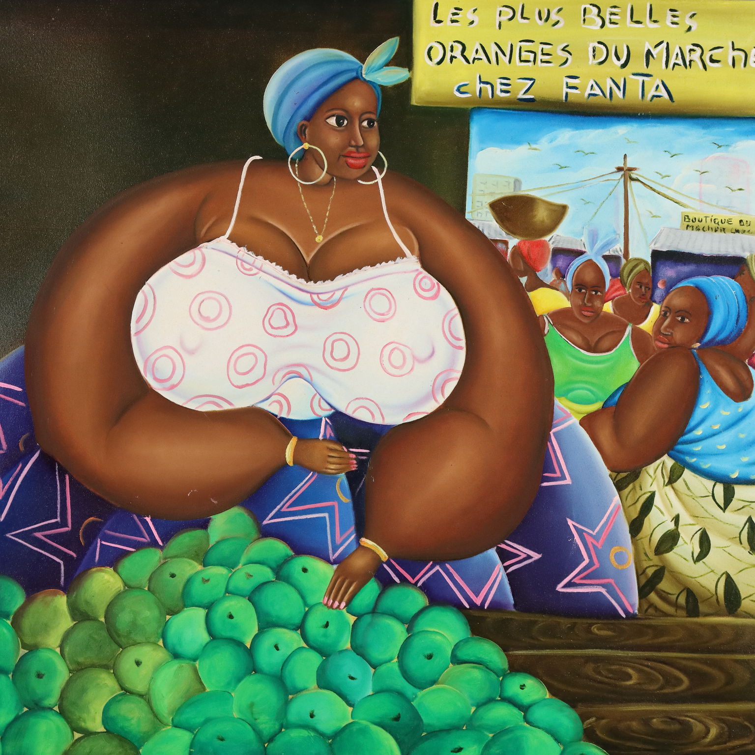Olio su tela. Africa occidentale. Il dipinto in stile naif raffigura una venditrice di arance all' interno di un mercato urbano. Questo tipo di dipinti, usati spesso come pubblicità per le bancarelle del mercato, rimandano ai valori tradizionali africani di maternità, fertilità e prosperità, ma trasposti in un contesto culturale contemporaneo.