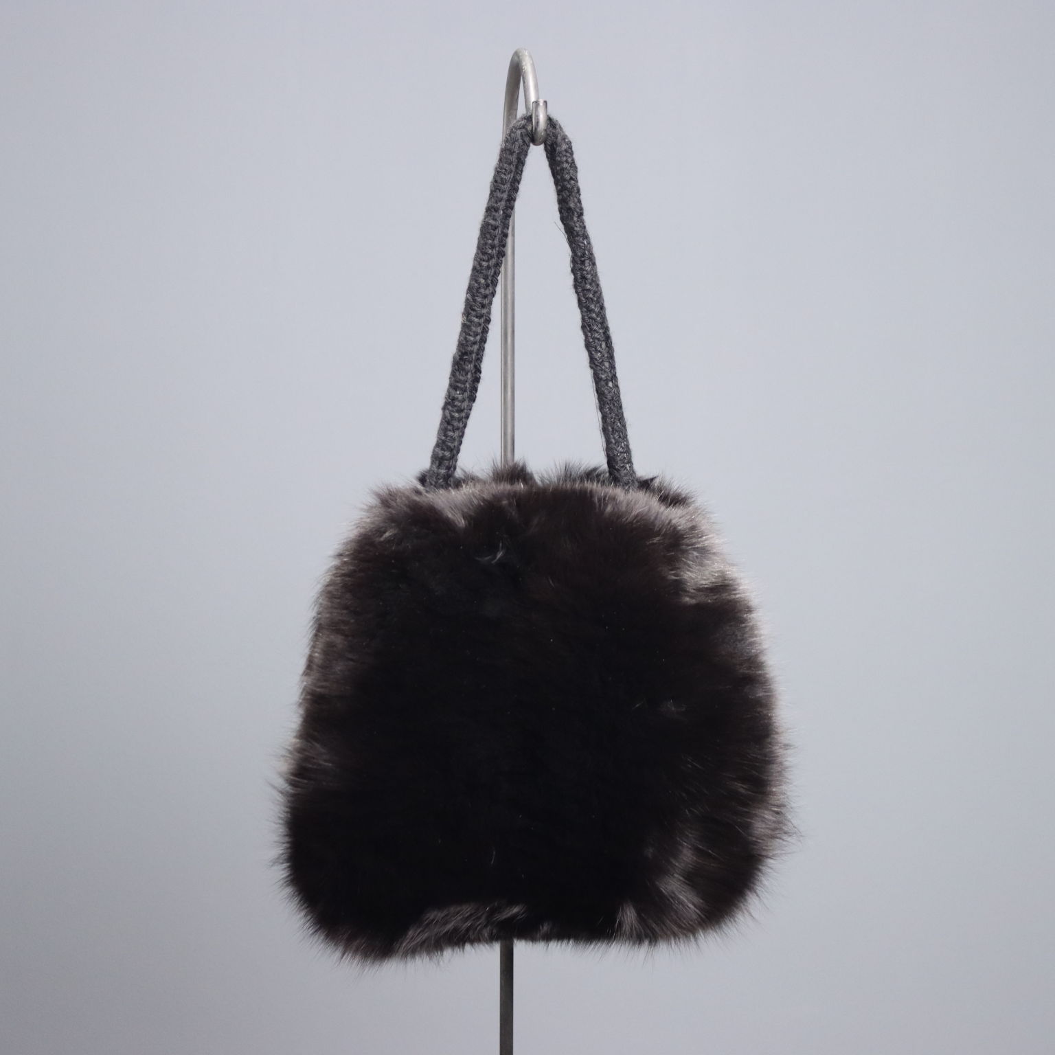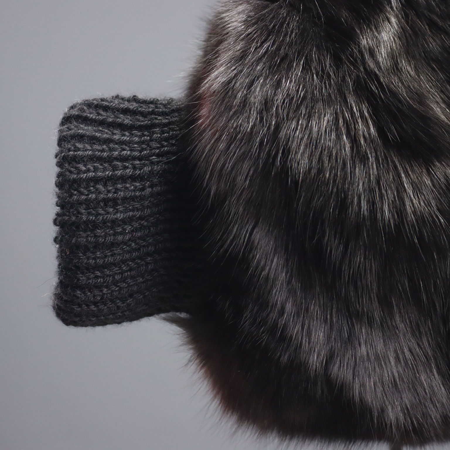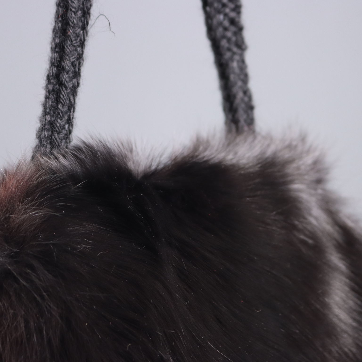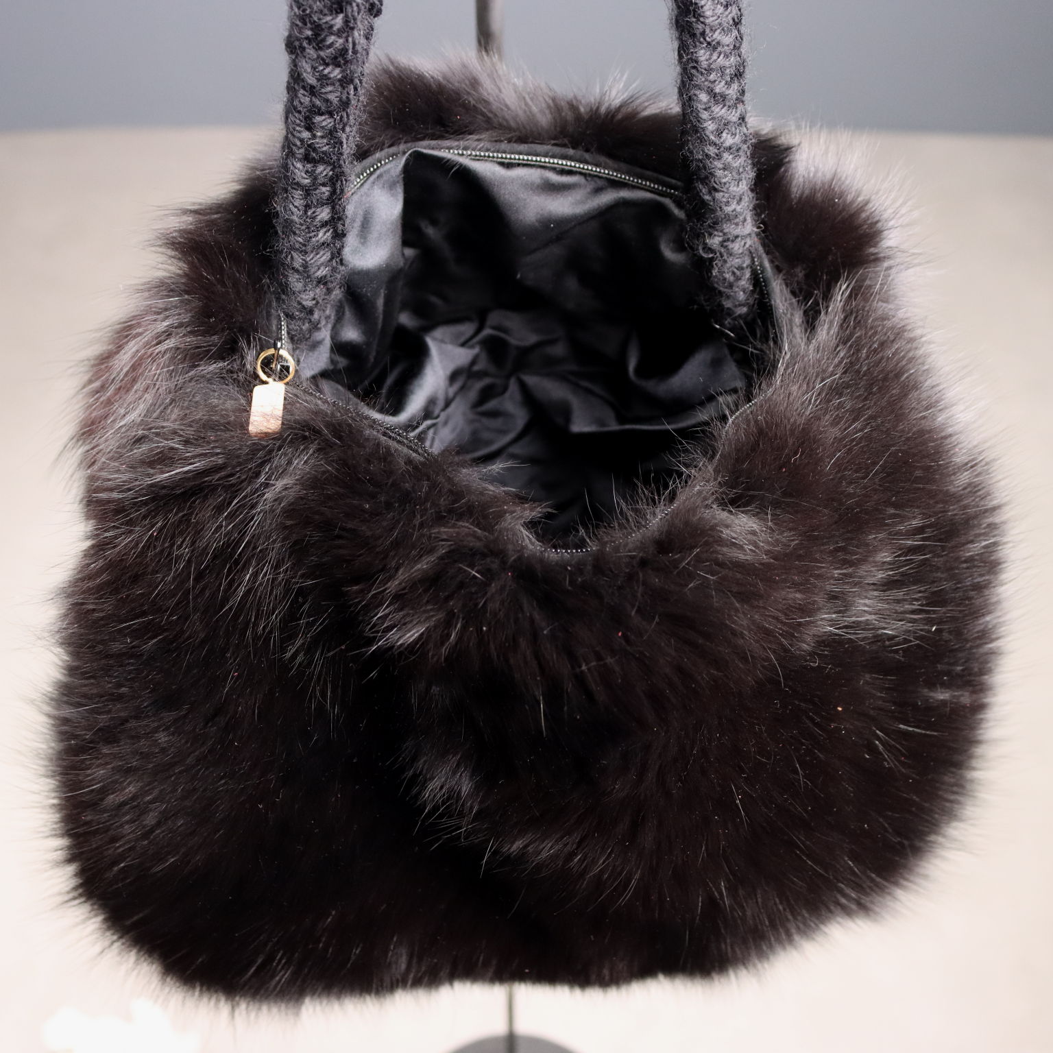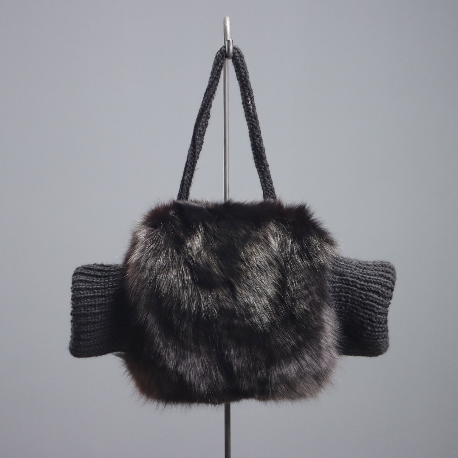 Borsa manicotto di manifattura sartoriale realizzata in pelliccia di volpe nera. Il manico e i manicotti sono in maglia di lana e l'interno è foderato.