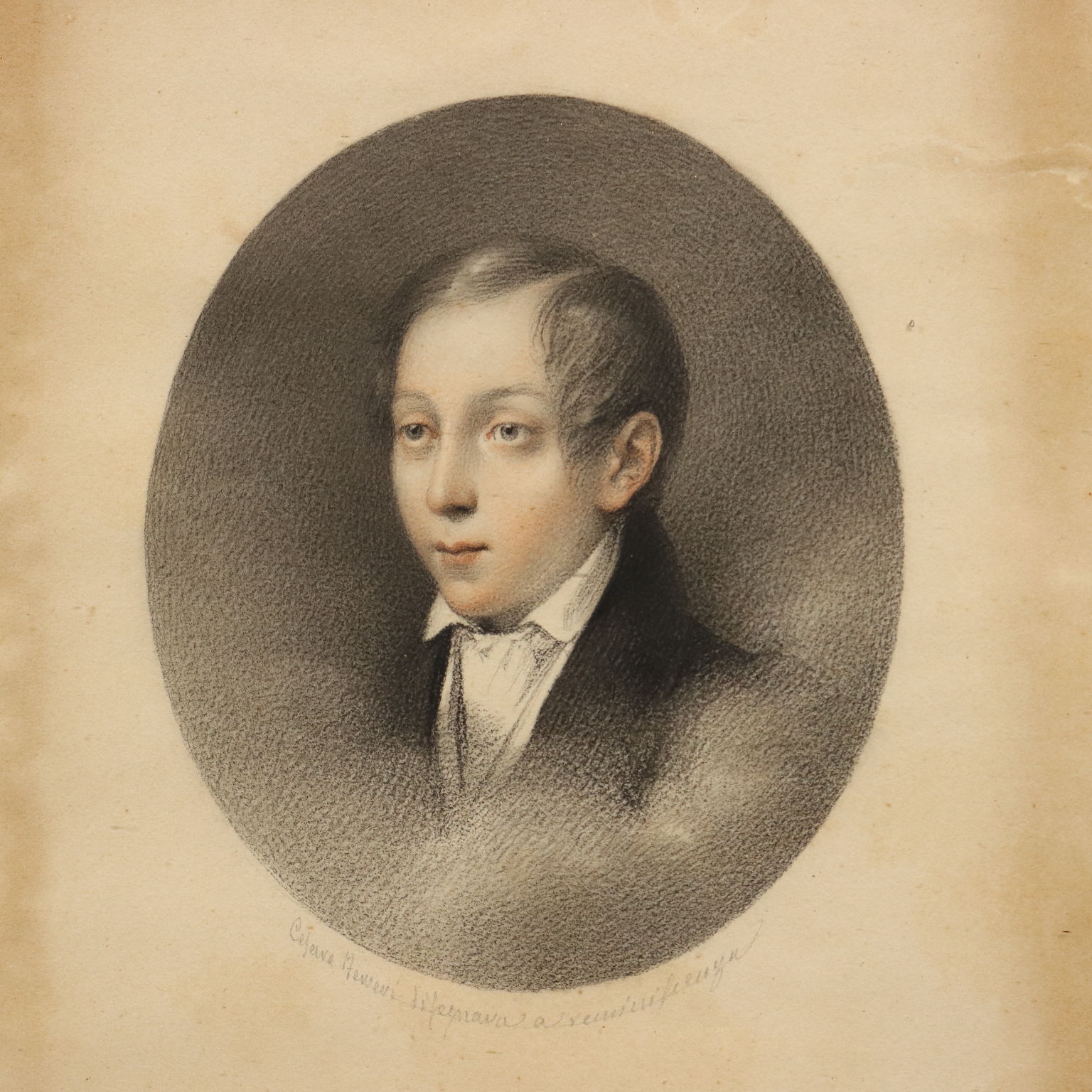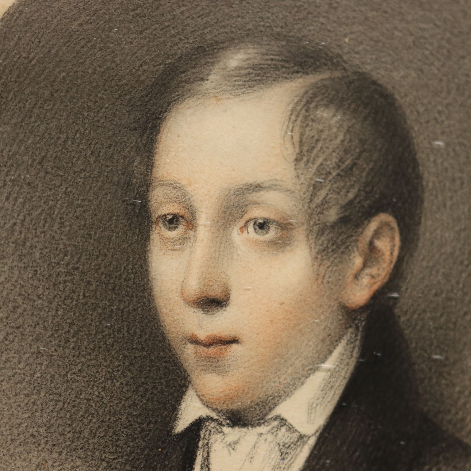 Pastelli su carta. Lungo il bordo inferiore del ritratto del ragazzo è presente la dicitura "Cesare Ferreri disegnava a reminiscenza". L'artista pavese si dedicò prevalentemente all' incisione, che insegnò anche nella scuola di disegno dell' università di Pavia di cui fu a lungo direttore dopo la morte del suo maestro Giovita Garavaglia. I due ritratti son presentati in cornici dorate coeve (ridorate).