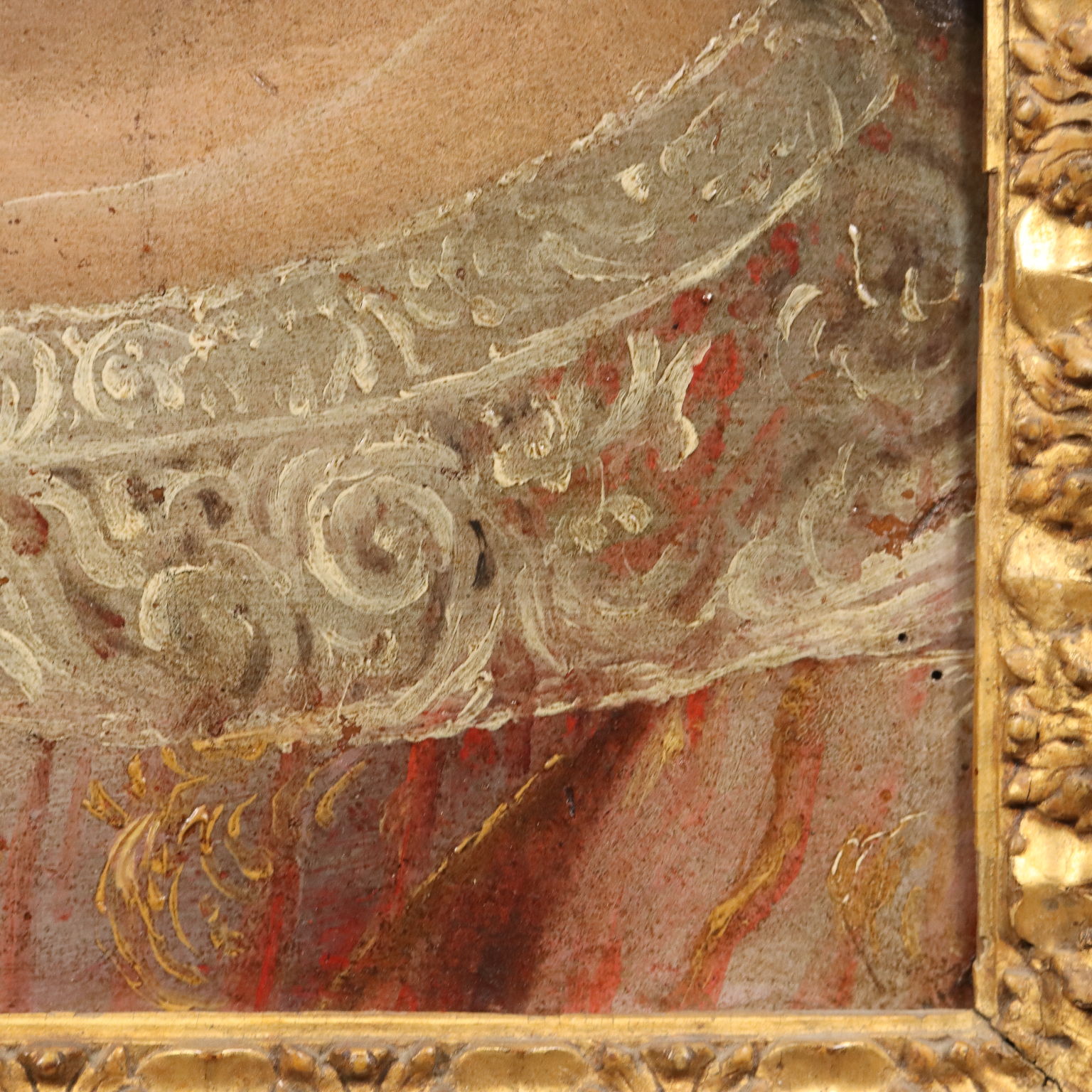 Olio su tavola. Scuola spagnola del XVII secolo. Intenso e penetrante lo sguardo di questa ragazzina, ritratta a mezzo busto in un delicato vestito rosa impreziosito da un colletto in pizzo, ma con i capelli trattenuti in una vivace e vaporosa cuffietta rossa, che dà un tocco malizioso al ritratto. Al retro è presente a matita una vecchia attribuzione a Jacopo Chimenti detto l' Empoli. Il dipinto è presentato in cornice antica, ridorata.
