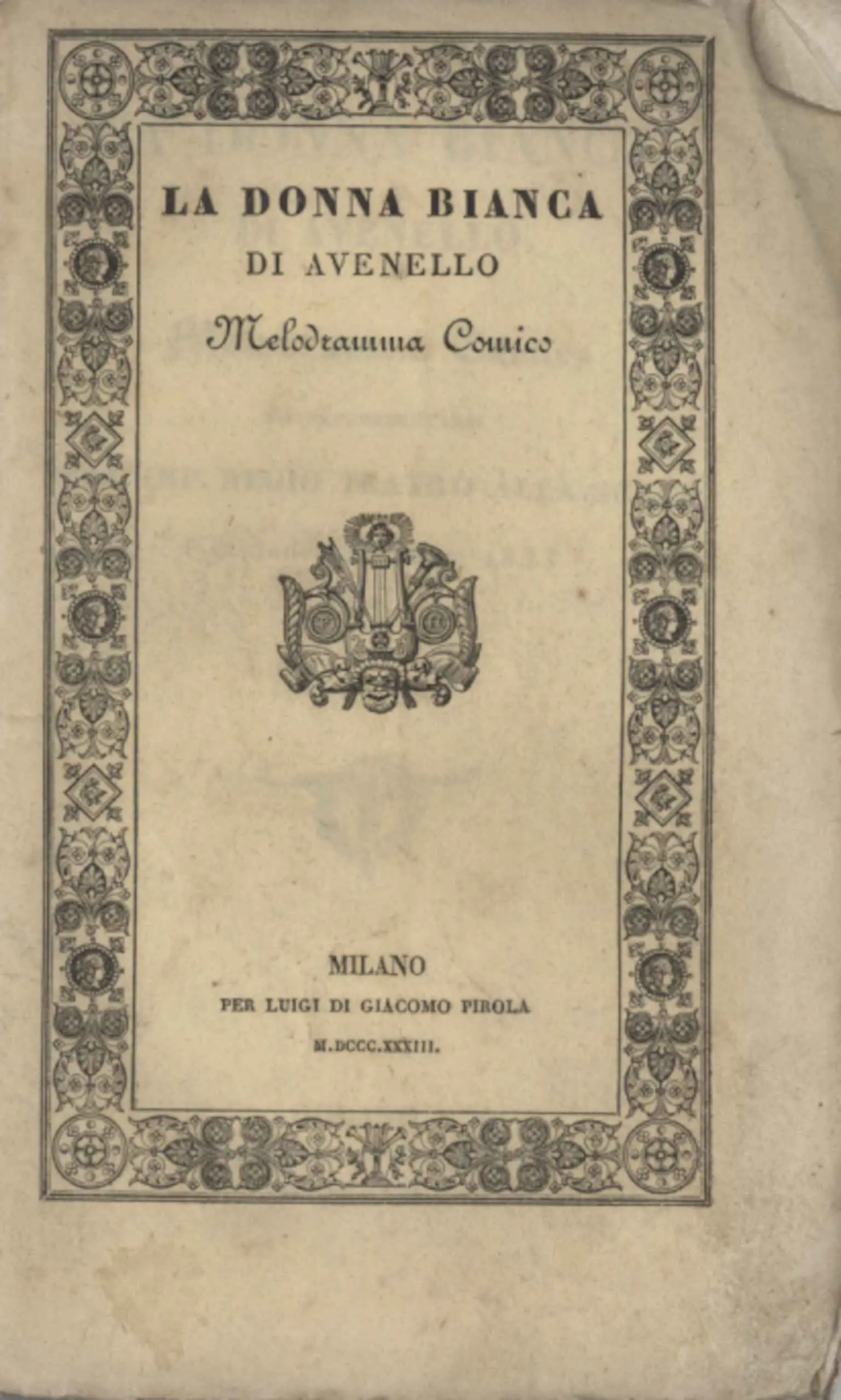La donna bianca di Avenello Melodramma Comico da rappresentarsi nell'Imp. Regio Teatro alla Scala l'Autunno dell'anno 1833