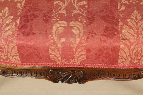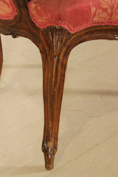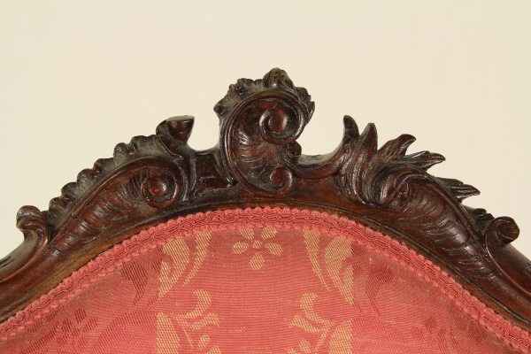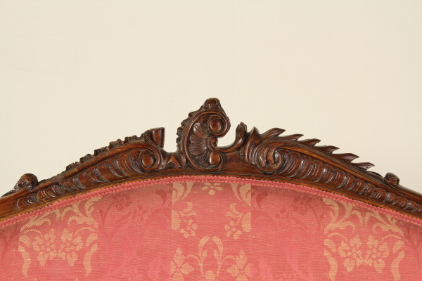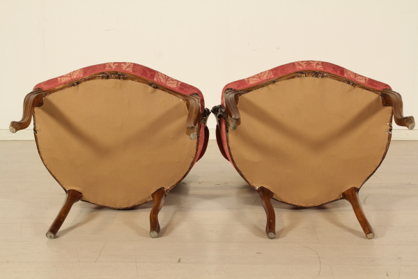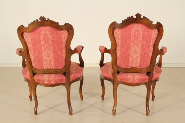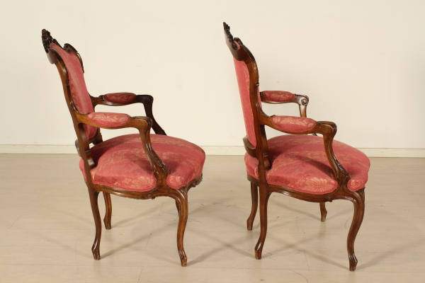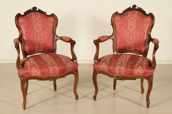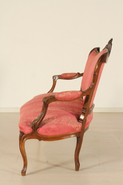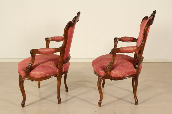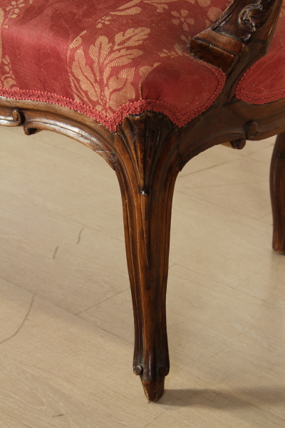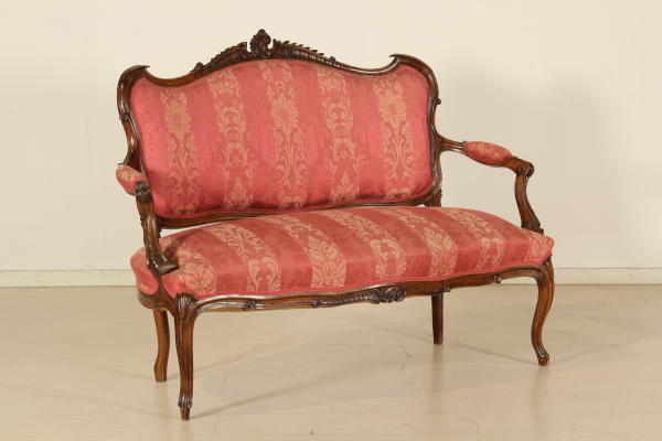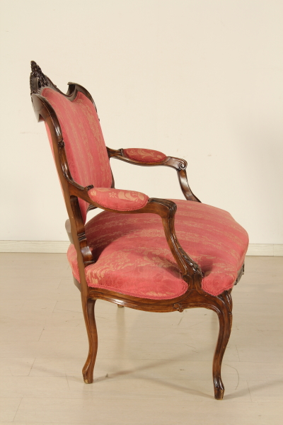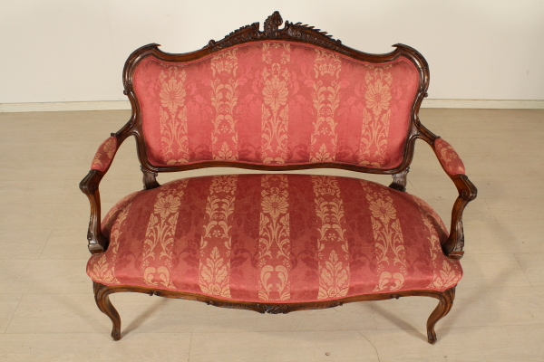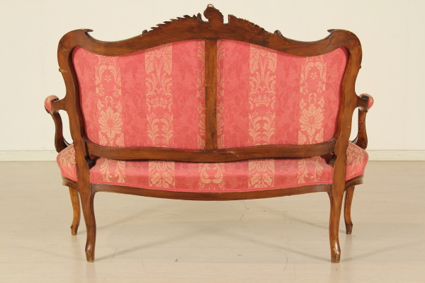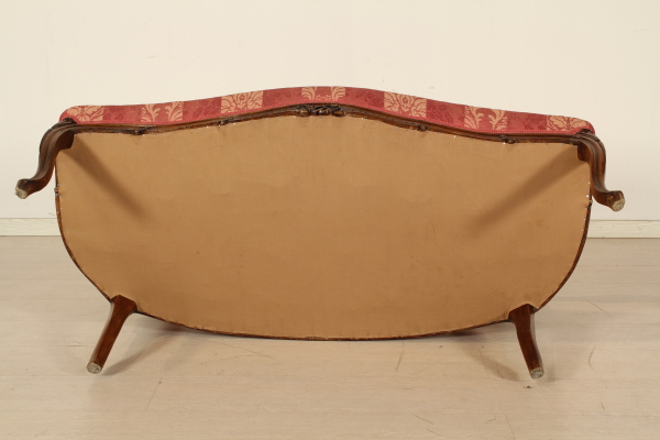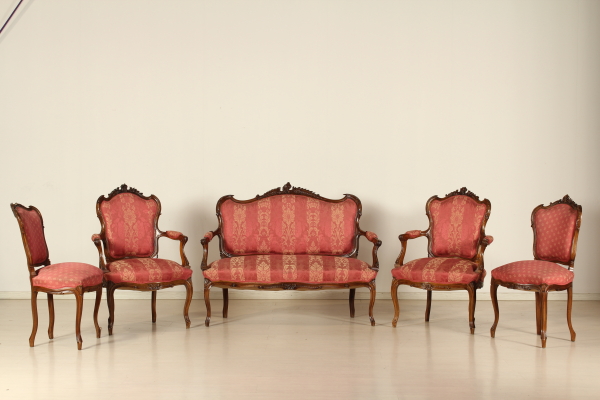 Salotto in stile imbottito completo composto da Divano due posti (98x122x55), Coppia di poltrone (98x63x60), Coppia di sedie (92x52x48). Dalla linea mossa con intagli, seduta e schienale imbottiti.