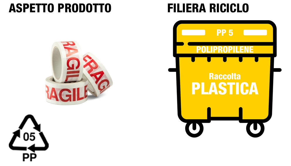 Nastro adesivoPuoi lasciare il nastro adesivo attaccato al materiale principale dell'imballaggio (scatola, caronte, pellicola) e seguire le istruzioni per il riciclaggio in base al materiale principale. |