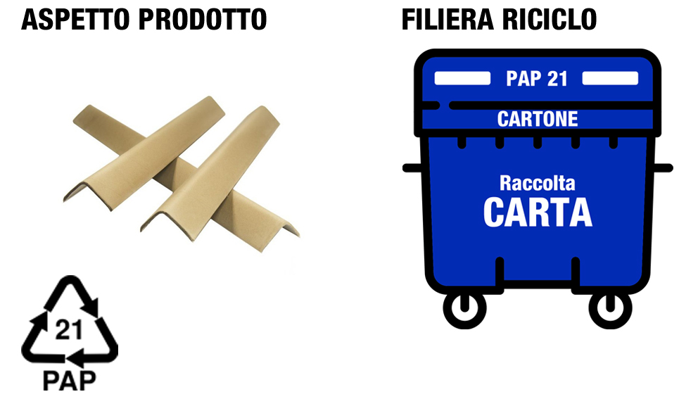 Angolari protettivi in cartoneIl riciclaggio degli angolari protettivi in cartone è ampiamente diffuso tramite programmi di riciclaggio della carta a domicilio e in Aree Ecologiche appositamente designate dal tuo Comune. |
