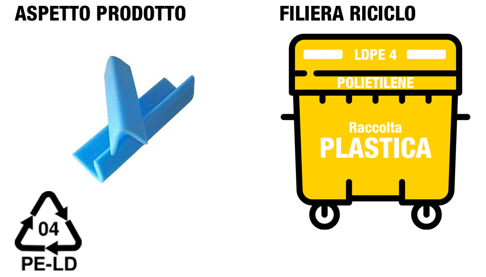 Angolari protettivi in polietileneIl riciclaggio degli angolari protettivi si effettua con la raccolta della plastica tramite programmi di riciclaggio a domicilio e in Aree Ecologiche appositamente designate dal tuo Comune. |