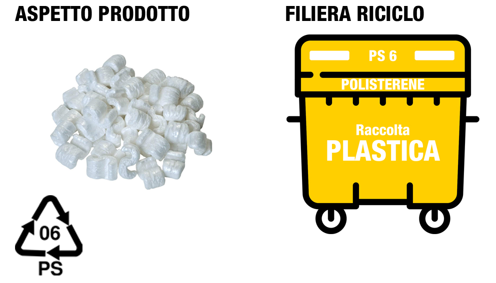 Chips PolistiroloIl riciclaggio dei chips riempitivi e protettivi in polistirolo si effettua con la raccolta della plastica tramite programmi di riciclaggio a domicilio e in Aree Ecologiche appositamente designate dal tuo Comune. |